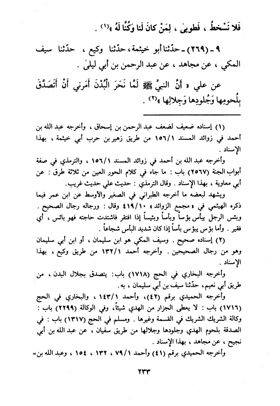 269 - حَدَّثَنَا أَبُو خَيْثَمَةَ، حَدَّثَنَا وَكِيعٌ، حَدَّثَنَا سَيْفٌ الْمَكِّيُّ، عَنْ مُجَاهِدٍ، عَنْ عَبْدِ الرَّحْمَنِ بْنِ أَبِي لَيْلَى، عَنْ عَلِيٍّ، أَنَّ النَّبِيَّ صَلَّى اللهُ عَلَيْهِ وَسَلَّمَ «§لَمَّا نَحَرَ الْبُدْنَ أَمَرَنِي أَنْ أَتَصَدَّقَ بِلُحُومِهَا وَجُلُودِهَا وَجِلَالِهَا» Kإسناده صحيح