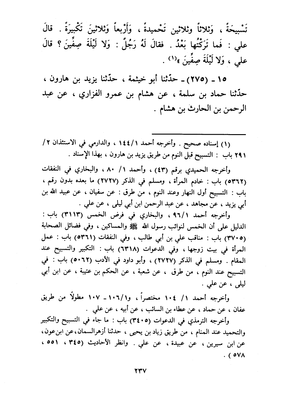 275 - حَدَّثَنَا أَبُو خَيْثَمَةَ، حَدَّثَنَا يَزِيدُ بْنُ هَارُونَ، حَدَّثَنَا حَمَّادُ بْنُ سَلَمَةَ، عَنْ هِشَامِ بْنِ عَمْرٍو الْفَزَارِيِّ، عَنْ عَبْدِ الرَّحْمَنِ بْنِ الْحَارِثِ بْنِ هِشَامٍ، عَنْ عَلِيٍّ، أَنَّ النَّبِيَّ صَلَّى اللهُ عَلَيْهِ وَسَلَّمَ كَانَ يَقُولُ فِي وِتْرِهِ: «§اللَّهُمَّ إِنِّي أَعُوذُ بِرِضَاكَ مِنْ سَخَطِكَ، وَأَعُوذُ بِمُعَافَاتِكَ مِنْ عُقُوبَتِكَ، وَأَعُوذُ بِكَ مِنْكَ، لَا أُحْصِي ثَنَاءً عَلَيْكَ، أَنْتَ كَمَا أَثْنَيْتَ عَلَى نَفْسِكَ» Kإسناده صحيح
