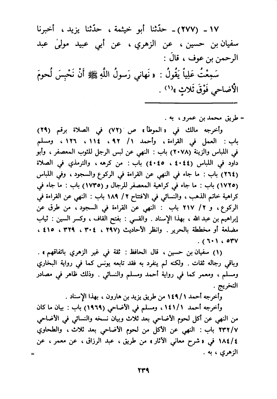 277 - حَدَّثَنَا أَبُو خَيْثَمَةَ، حَدَّثَنَا يَزِيدُ، أَخْبَرَنَا سُفْيَانُ بْنُ حُسَيْنٍ، عَنِ الزُّهْرِيِّ، عَنْ أَبِي عُبَيْدٍ، مَوْلَى عَبْدِ الرَّحْمَنِ بْنِ عَوْفٍ، قَالَ: سَمِعْتُ عَلِيًّا، يَقُولُ: «§نَهَانِي رَسُولُ اللَّهِ صَلَّى اللهُ عَلَيْهِ وَسَلَّمَ أَنْ نَحْبِسَ لُحُومَ الْأَضَاحِي فَوْقَ ثَلَاثٍ» Kأخرجه البخاري وأخرجه مسلم