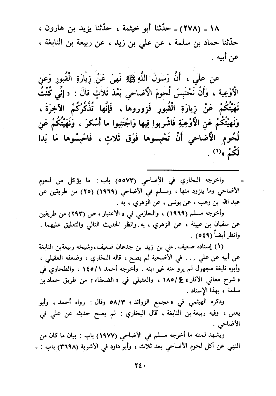 278 - حَدَّثَنَا أَبُو خَيْثَمَةَ، حَدَّثَنَا يَزِيدُ بْنُ هَارُونَ، حَدَّثَنَا حَمَّادُ بْنُ سَلَمَةَ، عَنْ عَلِيِّ بْنِ زَيْدٍ، عَنْ رَبِيعَةَ بْنِ النَّابِغَةِ، عَنْ أَبِيهِ، عَنْ عَلِيٍّ، أَنَّ رَسُولَ اللَّهِ صَلَّى اللهُ عَلَيْهِ وَسَلَّمَ نَهَى عَنْ زِيَارَةِ الْقُبُورِ، وَعَنِ الْأَوْعِيَةِ، وَأَنْ نَحْتَبِسَ لُحُومَ الْأَضَاحِي بَعْدَ ثَلَاثٍ، قَالَ: «إِنِّي §كُنْتُ نَهَيْتُكُمْ عَنْ زِيَارَةِ الْقُبُورِ فَزُورُوهَا، فَإِنَّهَا تُذَكِّرُكُمُ الْآخِرَةَ، وَنَهَيْتُكُمْ عَنِ الْأَوْعِيَةِ فَاشْرَبُوا فِيهَا وَاجْتَنِبُوا مَا أَسْكَرَ، وَنَهَيْتُكُمْ عَنْ لُحُومِ الْأَضَاحِي أَنْ تَحْبِسُوهَا فَوْقَ ثَلَاثٍ، فَاحْبِسُوهَا مَا بَدَا لَكُمْ» Kإسناده ضعيف