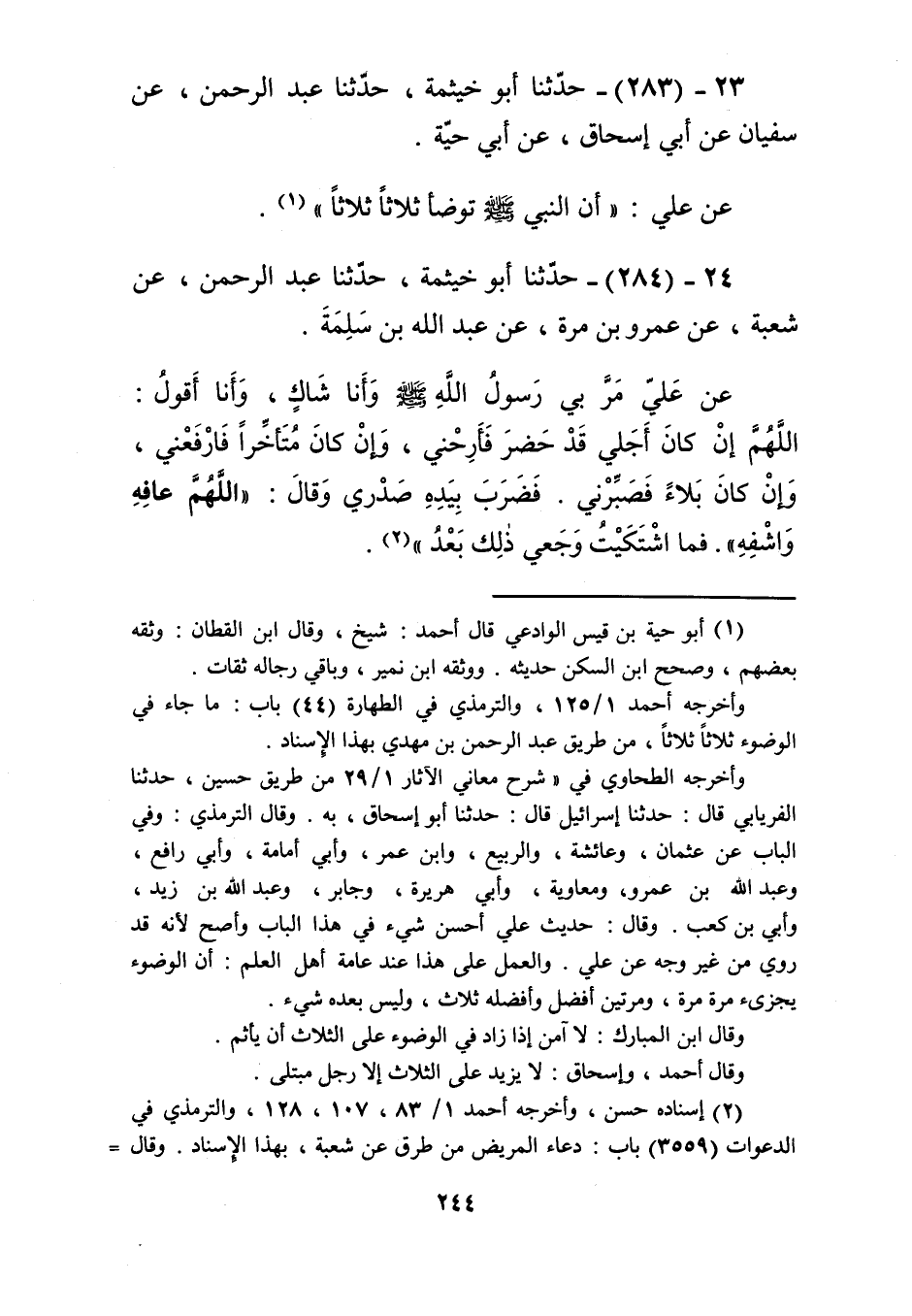 283 - حَدَّثَنَا أَبُو خَيْثَمَةَ، حَدَّثَنَا عَبْدُ الرَّحْمَنِ، عَنْ سُفْيَانَ، عَنْ أَبِي إِسْحَاقَ، عَنْ أَبِيَ حَيَّةَ، عَنْ عَلِيٍّ، أَنَّ النَّبِيَّ صَلَّى اللهُ عَلَيْهِ وَسَلَّمَ «§تَوَضَّأَ ثَلَاثًا ثَلَاثًا»