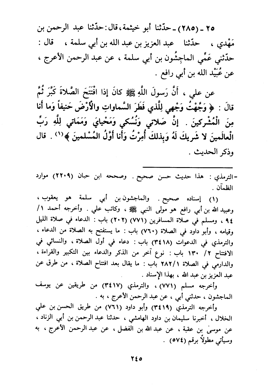 285 - حَدَّثَنَا أَبُو خَيْثَمَةَ، قَالَ: حَدَّثَنَا عَبْدُ الرَّحْمَنِ بْنُ مَهْدِيٍّ، حَدَّثَنَا عَبْدُ الْعَزِيزِ بْنُ عَبْدِ اللَّهِ بْنِ أَبِي سَلَمَةَ، قَالَ: حَدَّثَنِي عَمِّي الْمَاجِشُونُ بْنُ أَبِي سَلَمَةَ،، عَنْ عَبْدِ الرَّحْمَنِ الْأَعْرَجِ، عَنْ عُبَيْدِ اللَّهِ بْنِ أَبِي رَافِعٍ، عَنْ عَلِيٍّ، أَنَّ رَسُولَ اللَّهِ صَلَّى اللهُ عَلَيْهِ وَسَلَّمَ كَانَ §إِذَا افْتَتَحَ الصَّلَاةَ كَبَّرَ، ثُمَّ قَالَ: «وَجَّهْتُ وَجْهِيَ لِلَّذِي فَطَرَ السَّمَاوَاتِ وَالْأَرْضَ حَنِيفًا وَمَا أَنَا مِنَ الْمُشْرِكِينَ، إِنَّ صَلَاتِي وَنُسُكِي وَمَحْيَايَ وَمَمَاتِي لِلَّهِ رَبِّ الْعَالَمِينَ لَا شَرِيكَ لَهُ، وَبِذَلِكَ أُمِرْتُ وَأَنَا أَوَّلُ الْمُسْلِمِينَ». قَالَ: وَذَكَرَ الْحَدِيثَKإسناده صحيح