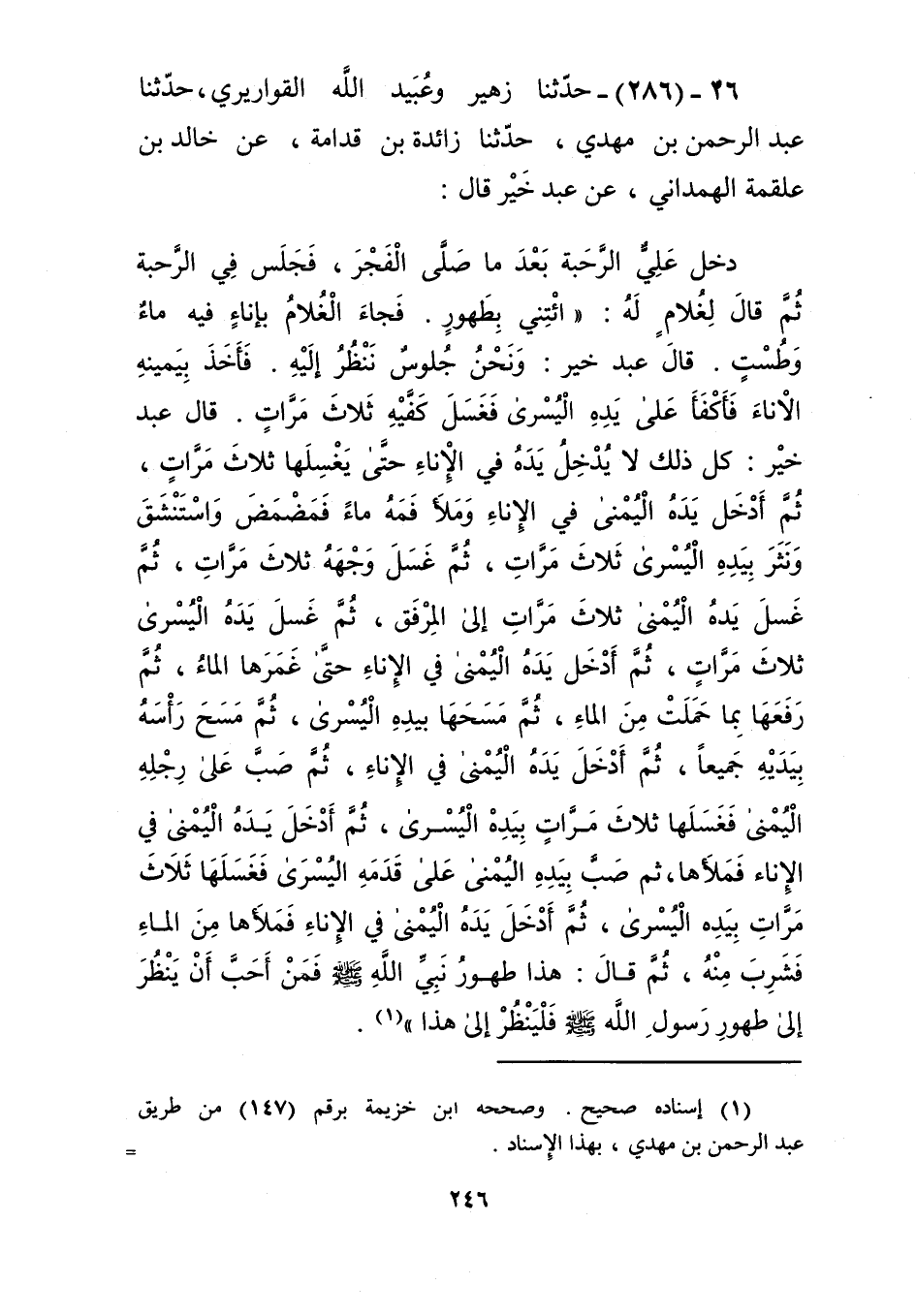 286 - حَدَّثَنَا زُهَيْرٌ، وَعُبَيْدُ اللَّهِ الْقَوَارِيرِيُّ، حَدَّثَنَا عَبْدُ الرَّحْمَنِ بْنُ مَهْدِيٍّ، حَدَّثَنَا زَائِدَةُ بْنُ قُدَامَةَ، عَنْ خَالِدِ بْنِ عَلْقَمَةَ الْهَمْدَانِيِّ، عَنْ عَبْدِ خَيْرٍ، قَالَ: دَخَلَ عَلِيٌّ، الرَّحَبَةَ بَعْدَ مَا صَلَّى الْفَجْرَ، فَجَلَسَ فِي الرَّحَبَةِ، ثُمَّ قَالَ لِغُلَامٍ لَهُ: ائْتِنِي بِطَهُورٍ. فَجَاءَ الْغُلَامُ بِإِنَاءٍ فِيهِ مَاءٌ وَطَسْتٍ، قَالَ عَبْدُ خَيْرٍ: وَنَحْنُ جُلُوسٌ نَنْظُرُ إِلَيْهِ، فَأَخَذَ بِيَمِينِهِ الْإِنَاءَ فَأَكْفَأَ عَلَى يَدِهِ الْيُسْرَى فَغَسَلَ كَفَّيْهِ ثَلَاثَ مَرَّاتٍ، قَالَ عَبْدُ خَيْرٍ: كُلُّ ذَلِكَ لَا يُدْخِلُ يَدَهُ فِي الْإِنَاءِ حَتَّى يَغْسِلَهَا ثَلَاثَ مَرَّاتٍ، ثُمَّ أَدْخَلَ يَدَهُ الْيُمْنَى فِي الْإِنَاءِ وَمَلَأَ فَمَهُ مَاءً فَمَضْمَضَ وَاسْتَنْشَقَ وَنَثَرَ بِيَدِهِ الْيُسْرَى ثَلَاثَ مَرَّاتٍ، ثُمَّ غَسَلَ وَجْهَهُ ثَلَاثَ مَرَّاتٍ، ثُمَّ غَسَلَ يَدَهُ الْيُمْنَى ثَلَاثَ مَرَّاتٍ إِلَى الْمِرْفَقِ، ثُمَّ غَسَلَ يَدَهُ الْيُسْرَى ثَلَاثَ مَرَّاتٍ، ثُمَّ أَدْخَلَ يَدَهُ الْيُمْنَى فِي الْإِنَاءِ حَتَّى غَمَرَهَا الْمَاءُ، ثُمَّ رَفَعَهَا بِمَا حَمَلَتْ مِنَ الْمَاءِ، ثُمَّ مَسَحَهَا بِيَدِهِ الْيُسْرَى، ثُمَّ مَسَحَ رَأْسَهُ بِيَدَيْهِ جَمِيعًا، ثُمَّ أَدْخَلَ يَدَهُ الْيُمْنَى فِي الْإِنَاءِ، ثُمَّ صَبَّ عَلَى رِجْلِهِ الْيُمْنَى فَغَسَلَهَا ثَلَاثَ مَرَّاتٍ بِيَدِهِ الْيُسْرَى، ثُمَّ أَدْخَلَ يَدَهُ الْيُمْنَى فِي الْإِنَاءِ فَمَلَأَهَا، ثُمَّ صَبَّ بِيَدِهِ الْيُمْنَى عَلَى قَدَمِهِ الْيُسْرَى فَغَسَلَهَا ثَلَاثَ مَرَّاتٍ بِيَدِهِ الْيُسْرَى، ثُمَّ أَدْخَلَ يَدَهُ الْيُمْنَى فِي الْإِنَاءِ فَمَلَأَهَا مِنَ الْمَاءِ فَشَرِبَ مِنْهُ، ثُمَّ قَالَ: «§هَذَا طُهُورُ نَبِيِّ اللَّهِ صَلَّى اللهُ عَلَيْهِ وَسَلَّمَ، فَمَنْ أَحَبَّ أَنْ يَنْظُرَ إِلَى طُهُورِ رَسُولِ اللَّهِ صَلَّى اللهُ عَلَيْهِ وَسَلَّمَ فَلْيَنْظُرْ إِلَى هَذَا» Kإسناده صحيح