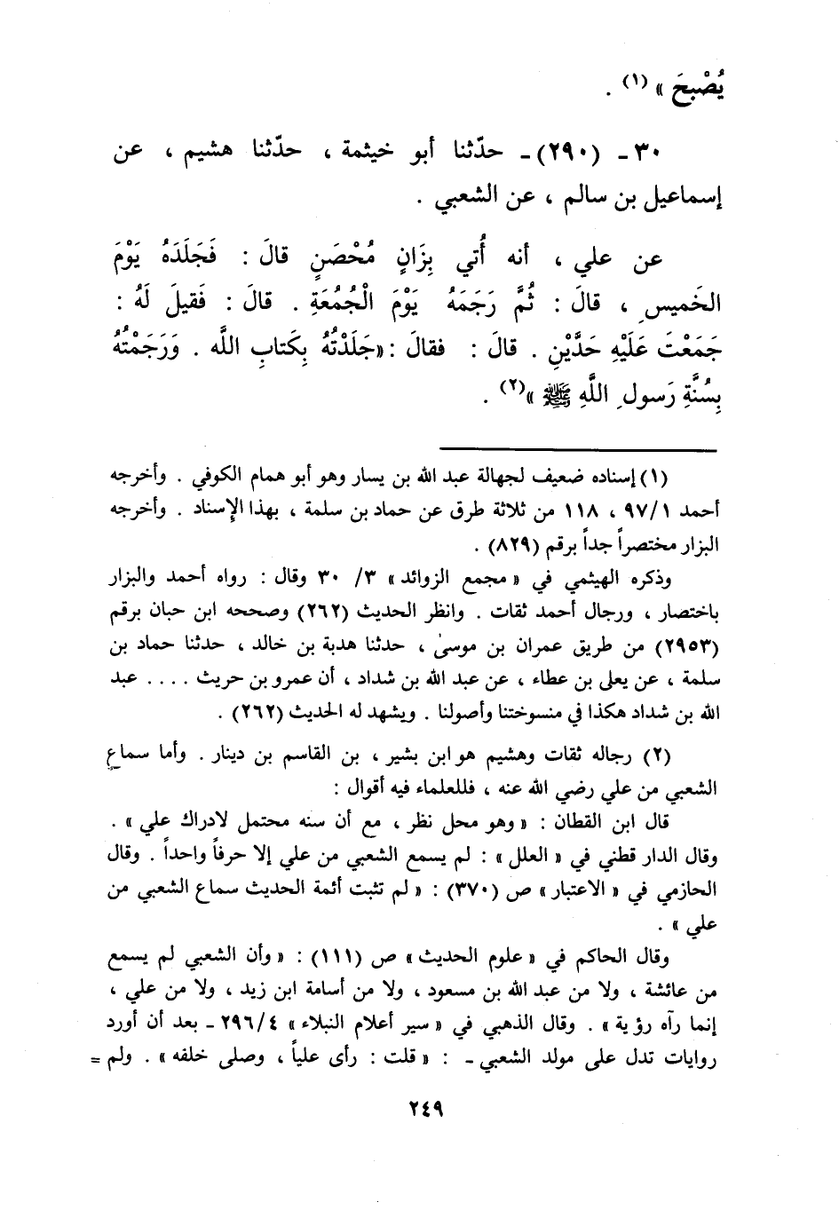 290 - حَدَّثَنَا أَبُو خَيْثَمَةَ، حَدَّثَنَا هُشَيْمٌ، عَنْ إِسْمَاعِيلَ بْنِ سَالِمٍ، عَنِ الشَّعْبِيِّ، عَنْ عَلِيٍّ، أَنَّهُ أُتِيَ بِزَانٍ مُحْصَنٍ قَالَ: فَجَلَدَهُ يَوْمَ الْخَمِيسِ، قَالَ: ثُمَّ رَجَمَهُ يَوْمَ الْجُمُعَةِ، قَالَ: فَقِيلَ لَهُ: جَمَعْتَ عَلَيْهِ حَدَّيْنِ، قَالَ: فَقَالَ: «§جَلَدْتُهُ بِكِتَابِ اللَّهِ، وَرَجَمْتُهُ بِسُنَّةِ رَسُولِ اللَّهِ صَلَّى اللهُ عَلَيْهِ وَسَلَّمَ» Kرجاله ثقات