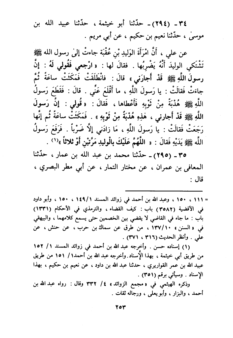 294 - حَدَّثَنَا أَبُو خَيْثَمَةَ، حَدَّثَنَا عُبَيْدُ اللَّهِ بْنُ مُوسَى، حَدَّثَنَا نُعَيْمُ بْنُ حَكِيمٍ، عَنْ أَبِي مَرْيَمَ، عَنْ عَلِيٍّ، أَنَّ امْرَأَةَ الْوَلِيدِ بْنِ عُقْبَةَ جَاءَتْ إِلَى رَسُولِ اللَّهِ صَلَّى اللهُ عَلَيْهِ وَسَلَّمَ تَشْتَكِي الْوَلِيدَ أَنَّهُ يَضْرِبُهَا، فَقَالَ لَهَا: " §ارْجِعِي فَقُولِي لَهُ: إِنَّ رَسُولَ اللَّهِ صَلَّى اللهُ عَلَيْهِ وَسَلَّمَ قَدْ أَجَارَنِي ". قَالَ: فَانْطَلَقَتْ فَمَكَثَتْ سَاعَةً ثُمَّ جَاءَتْ، فَقَالَتْ: يَا رَسُولَ اللَّهِ، مَا أَقْلَعَ عَنِّي. قَالَ: فَقَطَعَ رَسُولُ اللَّهِ صَلَّىاللَّهُ عَلَيْهِ وَسَلَّمَ هُدْبَةً مِنْ ثَوْبِهِ فَأَعْطَاهَا، فَقَالَ: " قُولِي: إِنَّ رَسُولَ اللَّهِ صَلَّى اللهُ عَلَيْهِ وَسَلَّمَ قَدْ أَجَارَنِي، هَذِهِ هُدْبَةٌ مِنْ ثَوْبِهِ ". فَمَكَثَتْ سَاعَةً، ثُمَّ إِنَّهَا رَجَعَتْ، فَقَالَتْ: يَا رَسُولَ اللَّهِ، مَا زَادَنِي إِلَّا ضَرْبًا. فَرَفَعَ رَسُولُ اللَّهِ صَلَّىاللَّهُ عَلَيْهِ وَسَلَّمَ يَدَيْهِ، فَقَالَ: «اللَّهُمَّ عَلَيْكَ بِالْوَلِيدِ» مَرَّتَيْنِ أَوْ ثَلَاثًاKإسناده حسن