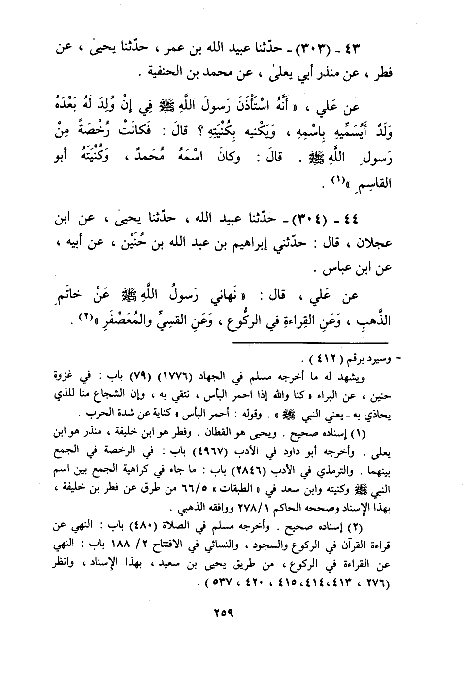304 - حَدَّثَنَا عُبَيْدُ اللَّهِ، حَدَّثَنَا يَحْيَى، عَنِ ابْنِ عَجْلَانَ، قَالَ: حَدَّثَنِي إِبْرَاهِيمُ بْنُ عَبْدِ اللَّهِ بْنِ حُنَيْنٍ، عَنْ أَبِيهِ، عَنِ ابْنِ عَبَّاسٍ، عَنْ عَلِيٍّ، قَالَ: «§نَهَانِي رَسُولُ اللَّهِ صَلَّى اللهُ عَلَيْهِ وَسَلَّمَ عَنْ خَاتَمِ الذَّهَبِ، وَعَنِ الْقِرَاءَةِ فِي الرُّكُوعِ، وَعَنِ الْقَسِّيِّ وَالْمُعَصْفَرِ» Kإسناده صحيح