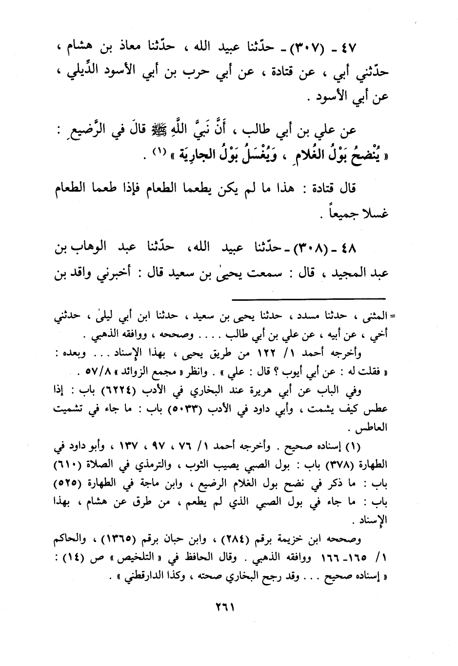 307 - حَدَّثَنَا عُبَيْدُ اللَّهِ، حَدَّثَنَا مُعَاذُ بْنُ هِشَامٍ، حَدَّثَنِي أَبِي، عَنْ قَتَادَةَ، عَنْ أَبِي حَرْبِ بْنِ أَبِي الْأَسْوَدِ الدِّيلِيِّ، عَنْ أَبِي الْأَسْوَدِ، عَنْ عَلِيِّ بْنِ أَبِي طَالِبٍ، أَنَّ نَبِيَّ اللَّهِ صَلَّى اللهُ عَلَيْهِ وَسَلَّمَ قَالَ فِي الرَّضِيعِ: «§يُنْضَحُ بَوْلُ الْغُلَامِ، وَيُغْسَلُ بَوْلُ الْجَارِيَةِ». قَالَ قَتَادَةُ: هَذَا مَا لَمْ يَكُنْ يَطْعَمَا الطَّعَامَ، فَإِذَا طَعِمَا الطَّعَامَ غُسِلَا جَمِيعًا "Kإسناده صحيح