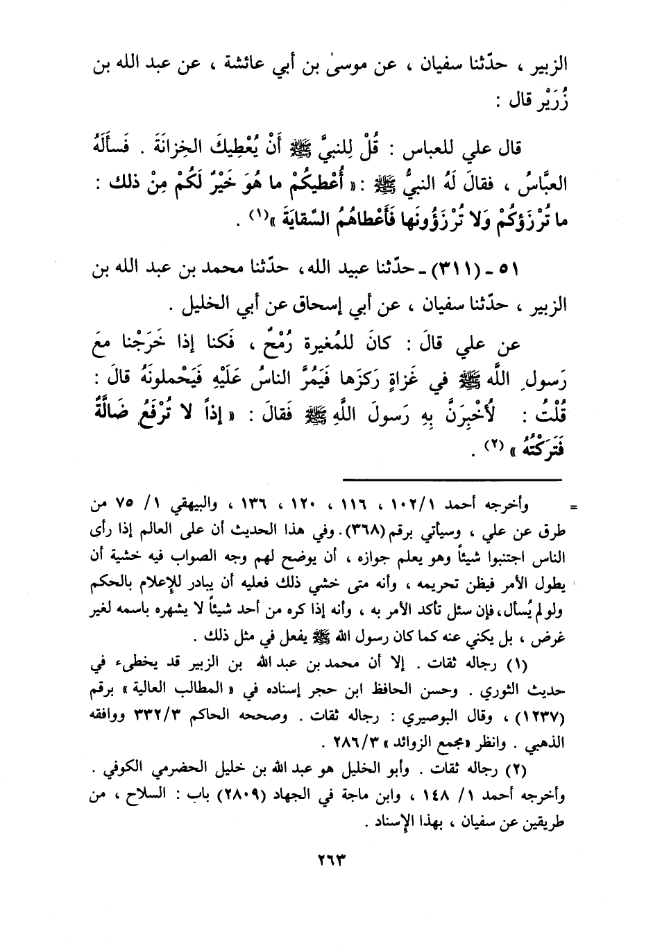 311 - حَدَّثَنَا عُبَيْدُ اللَّهِ، حَدَّثَنَا مُحَمَّدُ بْنُ عَبْدِ اللَّهِ بْنِ الزُّبَيْرِ، حَدَّثَنَا سُفْيَانُ، عَنْ أَبِي إِسْحَاقَ، عَنْ أَبِي الْخَلِيلِ، عَنْ عَلِيٍّ، قَالَ: كَانَ لِلْمُغِيرَةِ رُمْحٌ، فَكُنَّا إِذَا خَرَجْنَا مَعَ رَسُولِ اللَّهِ صَلَّى اللهُ عَلَيْهِ وَسَلَّمَ فِي غَزَاةٍ رَكَزَهَا فَيَمُرُّ النَّاسُ عَلَيْهِ فَيَحْمِلُونَهُ، قَالَ: قُلْتُ: لَأُخْبِرَنَّ بِهِ رَسُولَ اللَّهِ صَلَّى اللهُ عَلَيْهِ وَسَلَّمَ، فَقَالَ: «§إِذًا لَا تُرْفَعُ ضَالَّةٌ فَتَرَكْتُهُ» Kرجاله ثقات