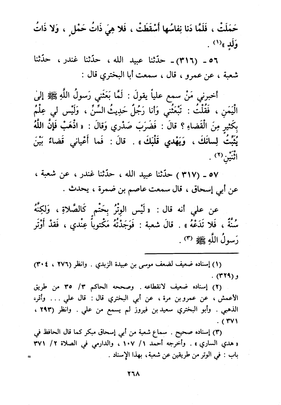 317 - حَدَّثَنَا عُبَيْدُ اللَّهِ، حَدَّثَنَا غُنْدَرٌ، عَنْ شُعْبَةَ، عَنْ أَبِي إِسْحَاقَ، قَالَ: سَمِعْتُ عَاصِمَ بْنَ ضَمْرَةَ، يُحَدِّثُ عَنْ عَلِيٍّ، أَنَّهُ قَالَ: «§لَيْسَ الْوِتْرُ بِحَتْمٍ كَالصَّلَاةِ، وَلَكِنَّهُ سُنَّةٌ، فَلَا تَدَعْهُ». قَالَ شُعْبَةُ: فَوَجَدْتُهُ مَكْتُوبًا عِنْدِي، فَقَدْ أَوْتَرَ رَسُولُ اللَّهِ صَلَّى اللهُ عَلَيْهِ وَسَلَّمَKإسناده صحيح