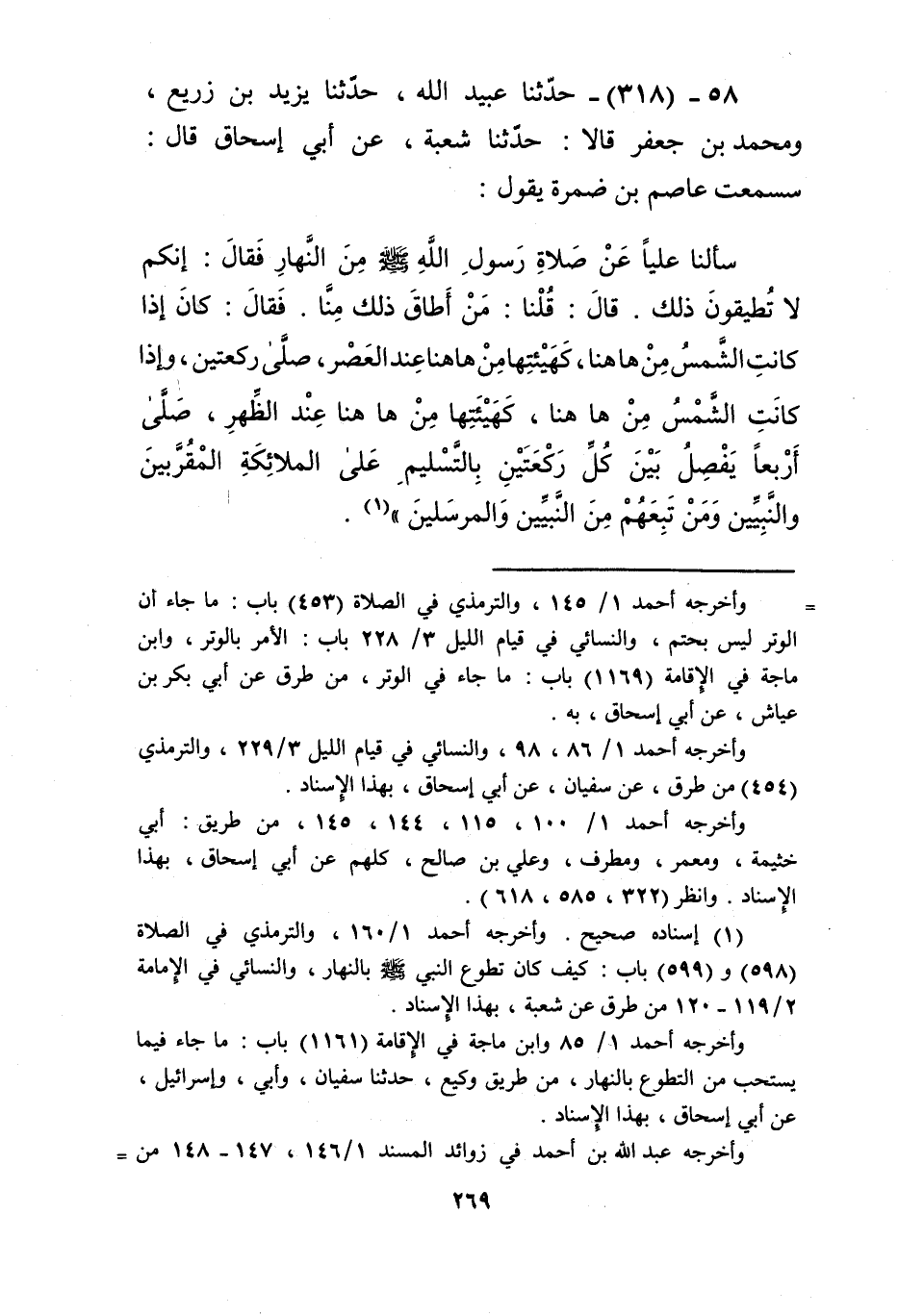 318 - حَدَّثَنَا عُبَيْدُ اللَّهِ، حَدَّثَنَا يَزِيدُ بْنُ زُرَيْعٍ، وَمُحَمَّدُ بْنُ جَعْفَرٍ، قَالَا: حَدَّثَنَا شُعْبَةُ، عَنْ أَبِي إِسْحَاقَ، قَالَ: سَمِعْتُ عَاصِمَ بْنَ ضَمْرَةَ، يَقُولُ: سَأَلْنَا عَلِيًّا عَنْ صَلَاةِ رَسُولِ اللَّهِ صَلَّى اللهُ عَلَيْهِ وَسَلَّمَ مِنَ النَّهَارِ، فَقَالَ: إِنَّكُمْ لَا تُطِيقُونَ ذَلِكَ. قَالَ: قُلْنَا: مَنْ أَطَاقَ ذَلِكَ مِنَّا، فَقَالَ: «كَانَ §إِذَا كَانَتِ الشَّمْسُ مِنْ هَا هُنَا، كَهَيْئَتِهَا مِنْ هَا هُنَا عِنْدَ الْعَصْرِ، صَلَّى رَكْعَتَيْنِ، وَإِذَا كَانَتِ الشَّمْسُ مِنْ هَا هُنَا، كَهَيْئَتِهَا مِنْ هَا هُنَا عِنْدَ الظُّهْرِ، صَلَّى أَرْبَعًا، يَفْصِلُ بَيْنَ كُلِّ رَكْعَتَيْنِ بِالتَّسْلِيمِ عَلَى الْمَلَائِكَةِ الْمُقَرَّبِينَ وَالنَّبِيِّينَ وَمَنْ تَبِعَهُمْ مِنَ النَّبِيِّينَ وَالْمُرْسَلِينَ» Kإسناده صحيح