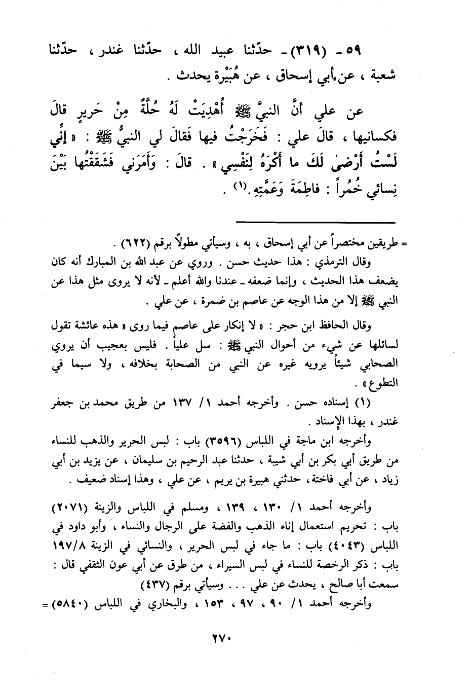 319 - حَدَّثَنَا عُبَيْدُ اللَّهِ، حَدَّثَنَا غُنْدَرٌ، حَدَّثَنَا شُعْبَةُ، عَنْ أَبِي إِسْحَاقَ، عَنْ هُبَيْرَةَ، يُحَدِّثُ عَنْ عَلِيٍّ، أَنَّ النَّبِيَّ صَلَّى اللهُ عَلَيْهِ وَسَلَّمَ أُهْدِيَتْ لَهُ حُلَّةٌ مِنْ حَرِيرٍ، قَالَ: فَكَسَانِيهَا، قَالَ عَلِيٌّ: فَخَرَجْتُ فِيهَا، فَقَالَ لِيَ النَّبِيُّ صَلَّى اللهُ عَلَيْهِ وَسَلَّمَ: «§إِنِّي لَسْتُ أَرْضَى لَكَ مَا أَكْرَهُ لِنَفْسِي»، قَالَ: وَأَمَرَنِي فَشَقَقْتُهَا بَيْنَ نِسَائِي خُمُرًا: فَاطِمَةَ وَعَمَّتِهِKإسناده حسن