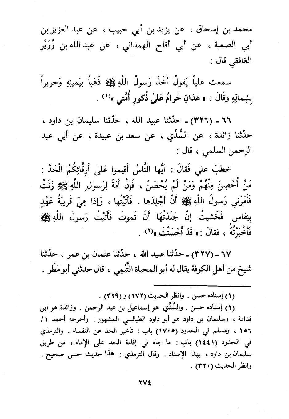 326 - حَدَّثَنَا عُبَيْدُ اللَّهِ، حَدَّثَنَا سُلَيْمَانُ بْنُ دَاوُدَ، حَدَّثَنَا زَائِدَةُ، عَنِ السُّدِّيِّ، عَنْ سَعْدِ بْنِ عُبَيْدَةَ، عَنْ أَبِي عَبْدِ الرَّحْمَنِ السُّلَمِيِّ، قَالَ: خَطَبَ عَلِيٌّ، فَقَالَ: أَيُّهَا النَّاسُ، أَقِيمُوا عَلَى أَرِقَّائِكُمُ الْحَدَّ: مَنْ أُحْصِنَ مِنْهُمْ وَمَنْ لَمْ يُحْصَنْ، فَإِنَّ أَمَةً لِرَسُولِ اللَّهِ صَلَّى اللهُ عَلَيْهِ وَسَلَّمَ زَنَتْ «§فَأَمَرَنِي رَسُولُ اللَّهِ صَلَّى اللهُ عَلَيْهِ وَسَلَّمَ أَنْ أَجْلِدَهَا» فَأَتَيْتُهَا، وَإِذَا هِيَ قَرِيبَةُ عَهْدٍ بِنِفَاسٍ، فَخَشِيتُ إِنْ جَلَدْتُهَا أَنْ تَمُوتَ، فَأَتَيْتُ رَسُولَ اللَّهِ صَلَّى اللهُ عَلَيْهِ وَسَلَّمَ فَأَخْبَرْتُهُ، فَقَالَ: «قَدْ أَحْسَنْتَ» Kإسناده حسن