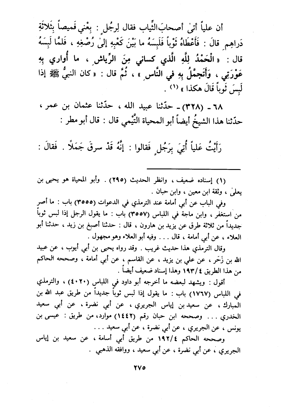 328 - حَدَّثَنَا عُبَيْدُ اللَّهِ، حَدَّثَنَا عُثْمَانُ بْنُ عُمَرَ، حَدَّثَنَا هَذَا الشَّيْخُ أَيْضًا أَبُو الْمُحَيَّاةِ التَّيْمِيُّ، قَالَ: قَالَ أَبُو مَطَرٍ: رَأَيْتُ عَلِيًّا أُتِيَ بِرَجُلٍ فَقَالُوا: إِنَّهُ قَدْ سَرَقَ جَمَلًا، فَقَالَ: مَا أُرَاكَ سَرَقْتَ قَالَ: بَلَى. قَالَ: فَلَعَلَّهُ شُبِّهَ لَكَ؟ قَالَ: بَلَى قَدْ سَرَقْتُ. قَالَ: اذْهَبْ بِهِ يَا قَنْبَرُ فَشُدَّ أُصْبُعَهُ، وَأَوْقِدِ النَّارَ، وَادْعُ الْجَزَّارَ يُقَطِّعْهُ، ثُمَّ انْتَظِرْ حَتَّى أَجِيءَ، فَلَمَّا جَاءَ، قَالَ لَهُ: سَرَقْتَ؟ قَالَ: لَا. فَتَرَكَهُ، قَالُوا: يَا أَمِيرَ الْمُؤْمِنِينَ، لِمَ تَرَكْتَهُ وَقَدْ أَقَرَّ لَكَ؟ قَالَ: أَخَذْتُهُ بِقَوْلِهِ وَأَتْرُكُهُ بِقَوْلِهِ. ثُمَّ قَالَ عَلِيٌّ: §أُتِيَ رَسُولُ اللَّهِ صَلَّى اللهُ عَلَيْهِ وَسَلَّمَ بِرَجُلٍ قَدْ سَرَقَ فَأَمَرَ بِقَطْعِهِ ثُمَّ بَكَى، فَقِيلَ: يَا رَسُولَ اللَّهِ، لِمَ تَبْكِي؟ فَقَالَ: «وَكَيْفَ لَا أَبْكِي وَأُمَّتِي تُقْطَعُ بَيْنَ أَظْهُرِكُمْ؟» قَالُوا: يَا رَسُولَ اللَّهِ، أَفَلَا عَفَوْتَ عَنْهُ؟ قَالَ: «ذَاكَ سُلْطَانُ سَوْءٍ الَّذِي يَعْفُو عَنِ الْحُدُودِ، وَلَكِنْ تَعَافَوْا بَيْنَكُمْ» Kإسناده ضعيف