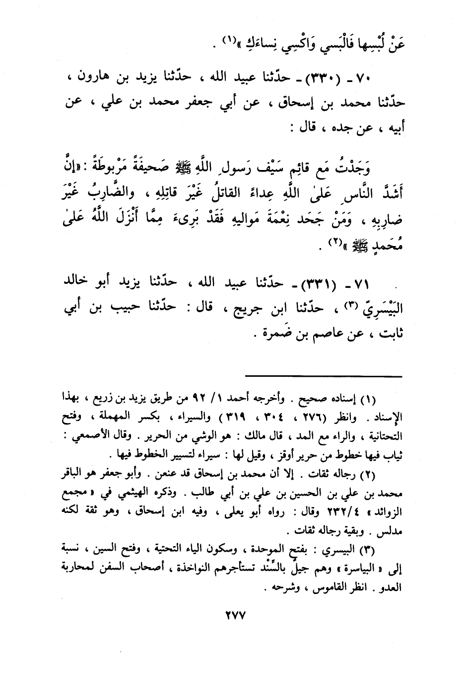 330 - حَدَّثَنَا عُبَيْدُ اللَّهِ، حَدَّثَنَا يَزِيدُ بْنُ هَارُونَ، حَدَّثَنَا مُحَمَّدُ بْنُ إِسْحَاقَ، عَنْ أَبِي جَعْفَرٍ مُحَمَّدِ بْنِ عَلِيٍّ، عَنْ أَبِيهِ، عَنْ جَدِّهِ، قَالَ: وَجَدْتُ مَعَ قَائِمِ سَيْفِ رَسُولِ اللَّهِ صَلَّى اللهُ عَلَيْهِ وَسَلَّمَ صَحِيفَةً مَرْبُوطَةً: «إِنَّ §أَشَدَّ النَّاسِ عَلَى اللَّهِ عَدَاءً الْقَاتِلُ غَيْرَ قَاتِلِهِ، وَالضَّارِبُ غَيْرَ ضَارِبِهِ، وَمَنْ جَحَدَ نِعْمَةَ مَوَالِيهِ فَقَدْ بَرِئَ مِمَّا أَنْزِلَ اللَّهُ عَلَى مُحَمَّدٍ صَلَّى اللهُ عَلَيْهِ وَسَلَّمَ» Kرجاله ثقات