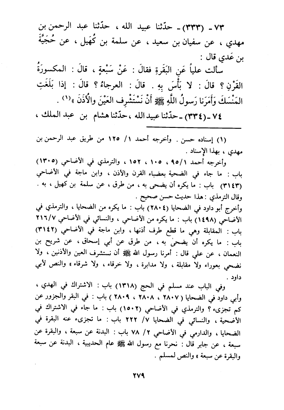 333 - حَدَّثَنَا عُبَيْدُ اللَّهِ، حَدَّثَنَا عَبْدُ الرَّحْمَنِ بْنُ مَهْدِيٍّ، عَنْ سُفْيَانَ بْنِ سَعِيدٍ، عَنْ سَلَمَةَ بْنِ كُهَيْلٍ، عَنْ حُجَيَّةَ بْنِ عَدِيٍّ، قَالَ: سَأَلْتُ عَلِيًّا عَنِ الْبَقَرَةِ، فَقَالَ: عَنْ سَبْعَةٍ، قَالَ: الْمَكْسُورَةُ الْقَرْنِ؟ قَالَ: لَا بَأْسَ بِهِ، قَالَ: الْعَرْجَاءُ؟ قَالَ: إِذَا بَلَغَتِ الْمَنْسَكَ «§وَأَمَرَنَا رَسُولُ اللَّهِ صَلَّى اللهُ عَلَيْهِ وَسَلَّمَ أَنْ نَسْتَشْرِفَ الْعَيْنَ وَالْأُذُنَ» Kإسناده حسن