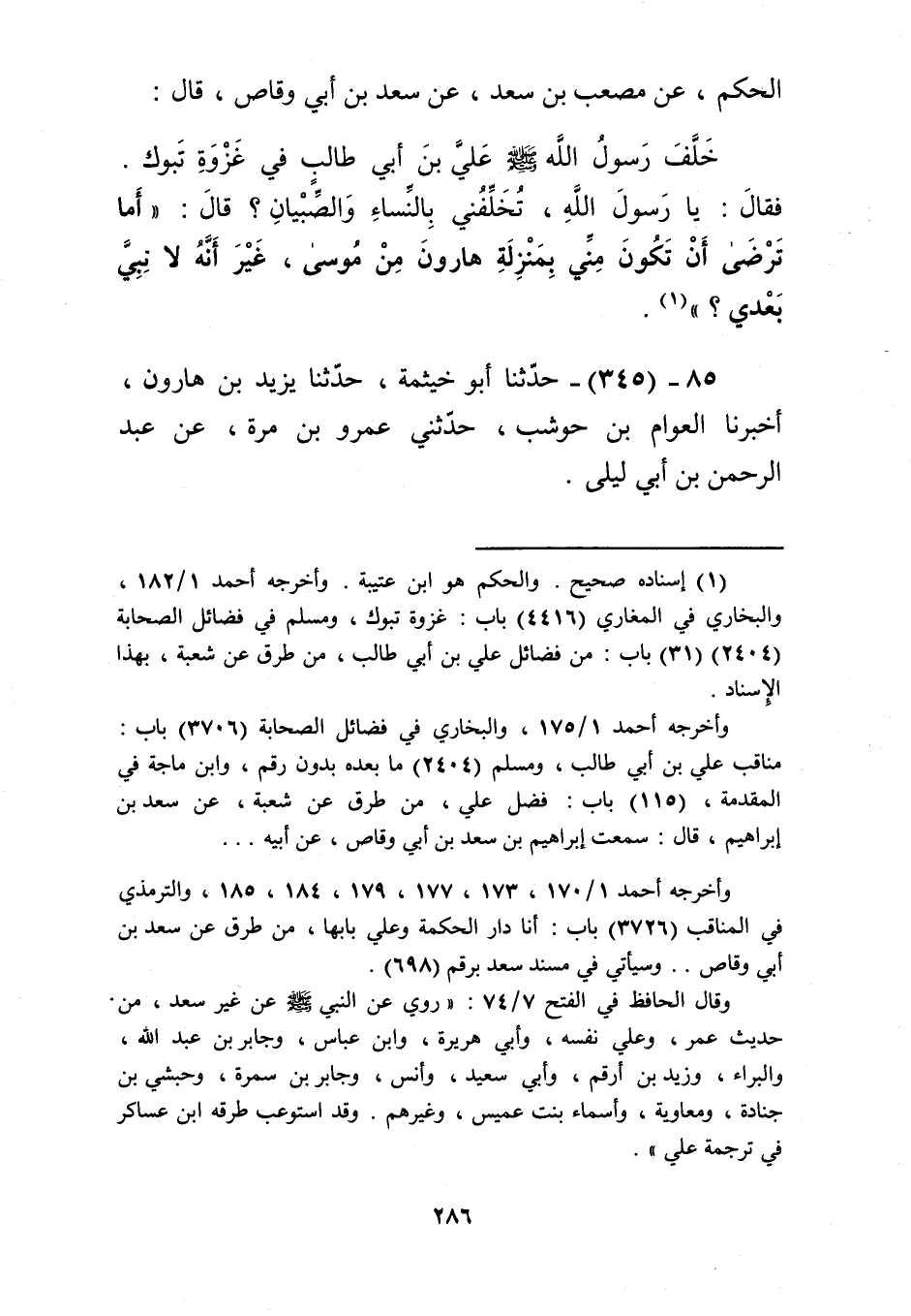 345 - حَدَّثَنَا أَبُو خَيْثَمَةَ، حَدَّثَنَا يَزِيدُ بْنُ هَارُونَ، أَخْبَرَنَا الْعَوَّامُ بْنُ حَوْشَبٍ، حَدَّثَنِي عَمْرُو بْنُ مُرَّةَ، عَنْ عَبْدِ الرَّحْمَنِ بْنِ أَبِي لَيْلَى، عَنْ عَلِيٍّ، قَالَ: أَتَانَا رَسُولُ اللَّهِ صَلَّى اللهُ عَلَيْهِ وَسَلَّمَ حَتَّى وَضْعَ قَدَمَهُ بَيْنِي وَبَيْنَ فَاطِمَةَ، §فَعَلَّمَنَا مَا نَقُولُ إِذَا أَخَذْنَا مَضَاجِعَنَا: «ثَلَاثًا وَثَلَاثِينَ تَسْبِيحَةً، وَثَلَاثًا وَثَلَاثِينَ تَحْمِيدَةً، وَأَرْبَعًا وَثَلَاثِينَ تَكْبِيرَةً» قَالَ: قَالَ عَلِيٌّ: فَمَا تَرَكْتُهَا بَعْدُ. فَقَالَ لَهُ رَجُلٌ: وَلَا لَيْلَةَ صِفِّينَ؟ قَالَ: وَلَا لَيْلَةَ صِفِّينَKإسناده صحيح