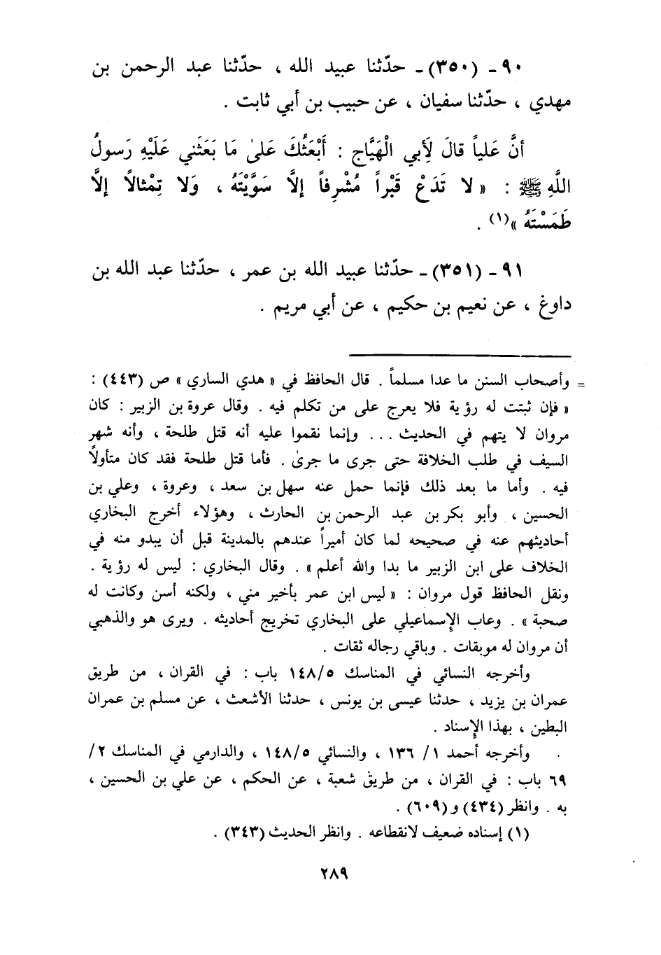 350 - حَدَّثَنَا عُبَيْدُ اللَّهِ، حَدَّثَنَا عَبْدُ الرَّحْمَنِ بْنُ مَهْدِيٍّ، حَدَّثَنَا سُفْيَانُ، عَنْ حَبِيبِ بْنِ أَبِي ثَابِتٍ، أَنَّ عَلِيًّا، قَالَ لِأَبِي الْهَيَّاجِ: أَبْعَثُكَ عَلَى مَا بَعَثَنِي عَلَيْهِ رَسُولُ اللَّهِ صَلَّى اللهُ عَلَيْهِ وَسَلَّمَ: «§لَا تَدَعْ قَبْرًا مُشْرِفًا إِلَّا سَوَّيْتَهُ، وَلَا تِمْثَالًا إِلَّا طَمَسْتَهُ» Kإسناده ضعيف