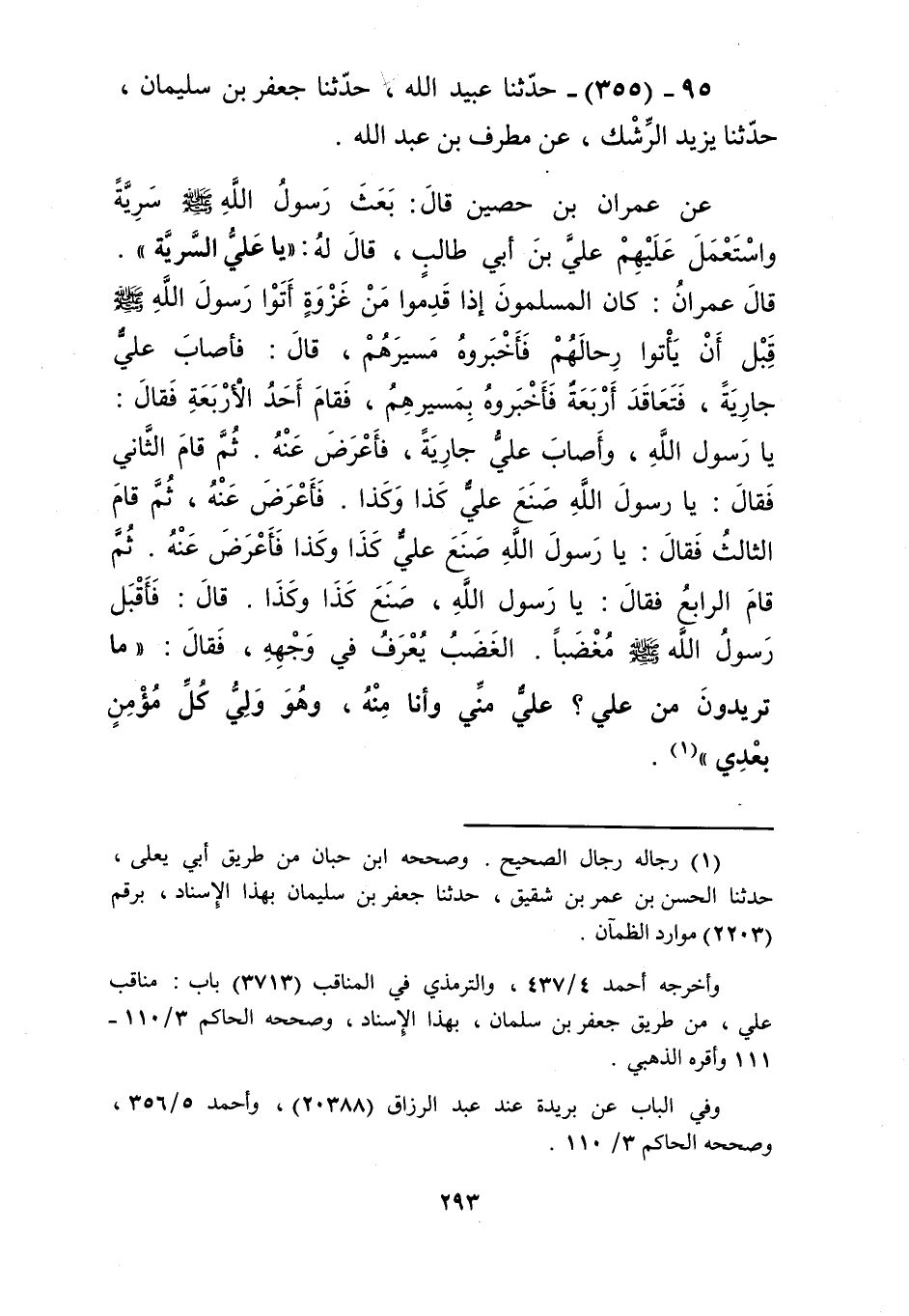 355 - حَدَّثَنَا عُبَيْدُ اللَّهِ، حَدَّثَنَا جَعْفَرُ بْنُ سُلَيْمَانَ، حَدَّثَنَا يَزِيدُ الرِّشْكِ، عَنْ مُطَرِّفِ بْنِ عَبْدِ اللَّهِ، عَنْ عِمْرَانَ بْنِ حُصَيْنٍ قَالَ: بَعَثَ رَسُولُ اللَّهِ صَلَّى اللهُ عَلَيْهِ وَسَلَّمَ سَرِيَّةً وَاسْتَعْمَلَ عَلَيْهِمْ عَلِيَّ بْنَ أَبِي طَالِبٍ قَالَ لَهُ: «يَا عَلِيُّ، السَّرِيَّةَ»، قَالَ عِمْرَانُ: كَانَ الْمُسْلِمُونَ إِذَا قَدِمُوا مِنْ غَزْوَةٍ أَتَوْا رَسُولَ اللَّهِ صَلَّى اللهُ عَلَيْهِ وَسَلَّمَ قَبْلَ أَنْ يَأْتُوا رِحَالَهُمْ، فَأَخْبَرُوهُ مَسِيرَهُمْ، قَالَ: فَأَصَابَ عَلِيٌّ جَارِيَةً، فَتَعَاقَدَ أَرْبَعَةٌ فَأَخْبَرُوهُ بِمَسِيرِهِمْ، فَقَامَ أَحَدُ الْأَرْبَعَةِ فَقَالَ: يَا رَسُولَ اللَّهِ، وَأَصَابَ عَلِيٌّ جَارِيَةً، فَأَعْرَضَ عَنْهُ، ثُمَّ قَامَ الثَّانِي فَقَالَ: يَا رَسُولَ اللَّهِ، صَنَعَ عَلِيٌّ كَذَا وَكَذَا، فَأَعْرَضَ عَنْهُ، ثُمَّ قَامَ الثَّالِثُ فَقَالَ: يَا رَسُولَ اللَّهِ، صَنَعَ عَلِيٌّ كَذَا وَكَذَا، فَأَعْرَضَ عَنْهُ، ثُمَّ قَامَ الرَّابِعُ فَقَالَ: يَا رَسُولَ اللَّهِ، صَنَعَ عَلِيٌّ كَذَا وَكَذَا. قَالَ: فَأَقْبَلَ رَسُولُ اللَّهِ صَلَّى اللهُ عَلَيْهِ وَسَلَّمَ مُغْضَبًا، الْغَضَبُ يُعْرَفُ فِي وَجْهِهِ، فَقَالَ: «§مَا تُرِيدُونَ مِنْ عَلِيٍّ؟ عَلِيٌّ مِنِّي وَأَنَا مِنْهُ، وَهُوَ وَلِيُّ كُلِّ مُؤْمِنٍ بَعْدِي» Kرجاله رجال الصحيح
