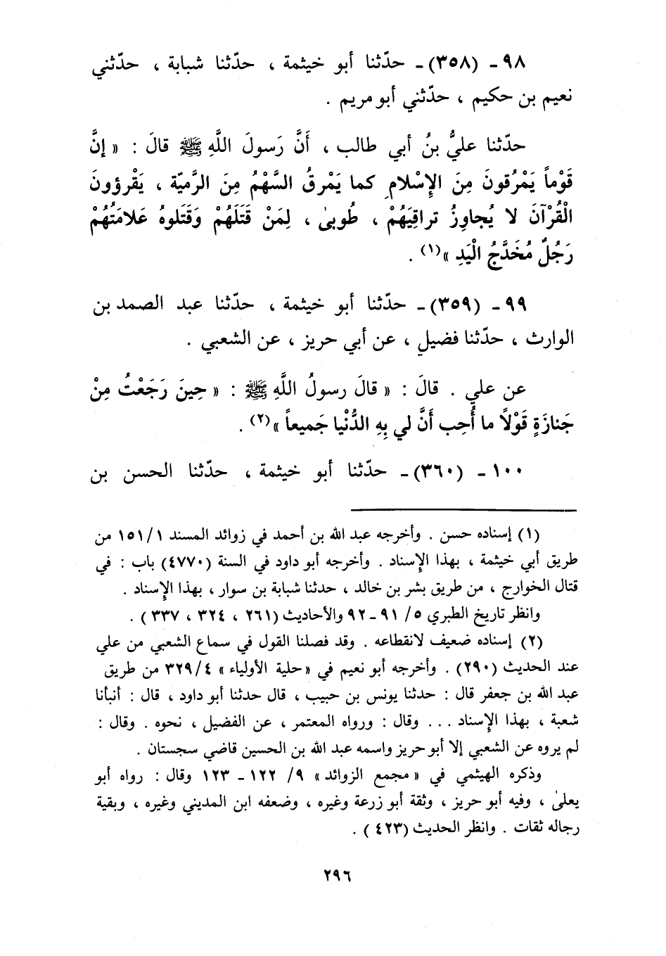 358 - حَدَّثَنَا أَبُو خَيْثَمَةَ، حَدَّثَنَا شَبَابَةُ، حَدَّثَنِي نُعَيْمُ بْنُ حَكِيمٍ، حَدَّثَنِي أَبُو مَرْيَمَ، حَدَّثَنَا عَلِيُّ بْنُ أَبِي طَالِبٍ، أَنَّ رَسُولَ اللَّهِ صَلَّى اللهُ عَلَيْهِ وَسَلَّمَ قَالَ: «§إِنَّ قَوْمًا يَمْرُقُونَ مِنَ الْإِسْلَامِ كَمَا يَمْرُقُ السَّهْمُ مِنَ الرَّمِيَّةِ، يَقْرَءُونَ الْقُرْآنَ لَا يُجَاوِزُ تَرَاقِيَهُمْ، طُوبَى لِمَنْ قَتَلَهُمْ وَقَتَلُوهُ، عَلَامَتُهُمْ رَجُلٌ مُخْدَجُ الْيَدِ» Kإسناده حسن