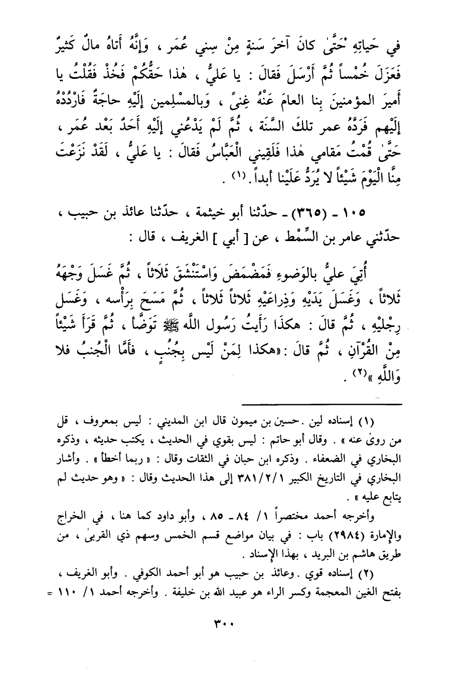 365 - حَدَّثَنَا أَبُو خَيْثَمَةَ، حَدَّثَنَا عَائِذُ بْنُ حَبِيبٍ، حَدَّثَنِي عَامِرُ بْنُ السِّمْطِ، عَنْ أَبِي الْغَرِيفِ، قَالَ: أُتِيَ عَلِيٌّ، بِالْوَضُوءِ، فَمَضْمَضَ وَاسْتَنْشَقَ ثَلَاثًا، ثُمَّ غَسَلَ وَجْهَهُ ثَلَاثًا، وَغَسَلَ يَدَيْهِ وَذِرَاعَيْهِ ثَلَاثًا ثَلَاثًا، ثُمَّ مَسَحَ بِرَأْسِهِ، وَغَسَلَ رِجْلَيْهِ، ثُمَّ قَالَ: هَكَذَا رَأَيْتُ رَسُولَ اللَّهِ صَلَّى اللهُ عَلَيْهِ وَسَلَّمَ §تَوَضَّأَ، ثُمَّ قَرَأَ شَيْئًا مِنَ الْقُرْآنِ، ثُمَّ قَالَ: «هَكَذَا لِمَنْ لَيْسَ بِجُنُبٍ، فَأَمَّا الْجُنُبُ فَلَا وَاللَّهِ» Kإسناده قوي