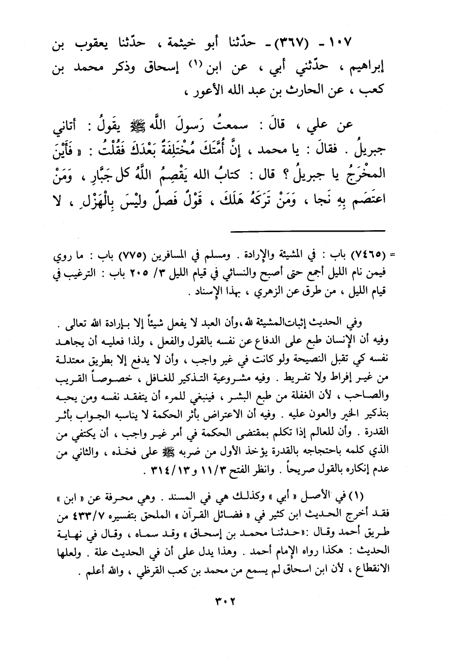 367 - حَدَّثَنَا أَبُو خَيْثَمَةَ، حَدَّثَنَا يَعْقُوبُ بْنُ إِبْرَاهِيمَ، حَدَّثَنِي أَبِي، عَنِ ابْنِ إِسْحَاقَ، وَذَكَرَ مُحَمَّدُ بْنُ كَعْبٍ، عَنِ الْحَارِثِ بْنِ عَبْدِ اللَّهِ الْأَعْوَرِ، عَنْ عَلِيٍّ، قَالَ: سَمِعْتُ رَسُولَ اللَّهِ صَلَّى اللهُ عَلَيْهِ وَسَلَّمَ يَقُولُ: " §أَتَانِي جِبْرِيلُ فَقَالَ: يَا مُحَمَّدُ، إِنَّ أُمَّتَكَ مُخْتَلِفَةٌ بَعْدَكَ، فَقُلْتُ: فَأَيْنَ الْمَخْرَجُ يَا جِبْرِيلُ؟ قَالَ: كِتَابُ اللَّهِ، يَقْصِمُ اللَّهُ كُلَّ جَبَّارٍ، وَمَنِ اعْتَصَمَ بِهِ نَجَا، وَمَنْ تَرَكَهُ هَلَكَ، قَوْلٌ فَصْلٌ وَلَيْسَ بِالْهَزْلِ، لَا تَخْتَلِقُهُ الْأَلْسُنُ، وَلَا يَنْفَذُ عَنْ طُولِ الرَّدِّ، وَلَا تَفْنَى عَجَائِبُهُ، فِيهِ نَبَأُ مَنْ كَانَ قَبْلَكُمْ، وَخَبَرُ مَا هُوَ كَائِنٌ بَعْدَكُمْ "Kإسناده ضعيف