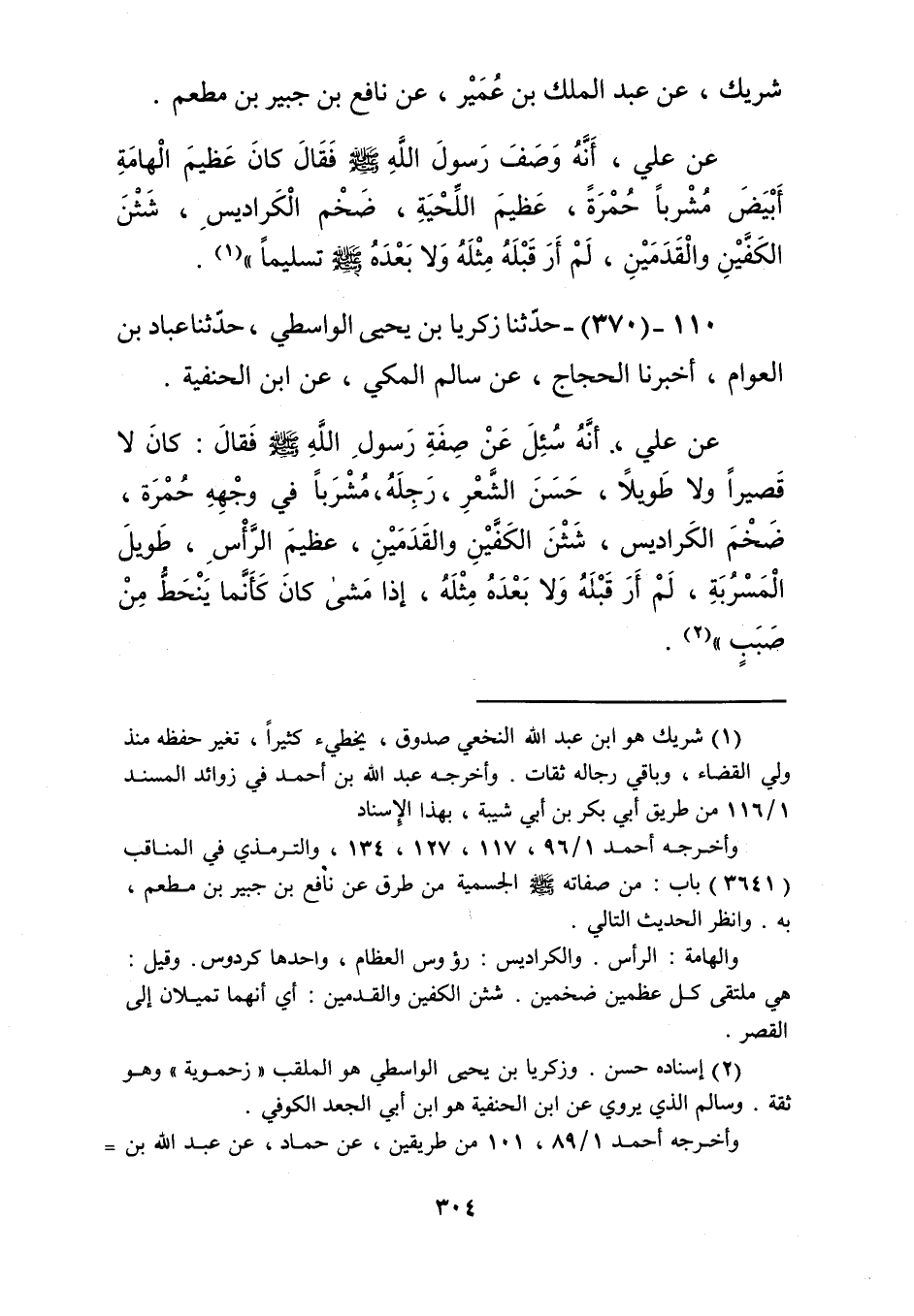 370 - حَدَّثَنَا زَكَرِيَّا بْنُ يَحْيَى الْوَاسِطِيُّ، حَدَّثَنَا عَبَّادُ بْنُ الْعَوَّامِ، أَخْبَرَنَا الْحَجَّاجُ، عَنْ سَالِمٍ الْمَكِّيِّ، عَنِ ابْنِ الْحَنَفِيَّةِ، عَنْ عَلِيٍّ، أَنَّهُ سُئِلَ عَنْ صِفَةِ رَسُولِ اللَّهِ صَلَّى اللهُ عَلَيْهِ وَسَلَّمَ فَقَالَ: «كَانَ §لَا قَصِيرًا وَلَا طَوِيلًا، حَسَنَ الشَّعْرِ رَجِلَهُ، مُشْرَبًا فِي وَجْهِهِ حُمْرَةٌ، ضَخْمَ الْكَرَادِيسِ، شَثْنَ الْكَفَّيْنِ وَالْقَدَمَيْنِ، عَظِيمَ الرَّأْسِ، طَوِيلَ الْمَسْرُبَةِ، لَمْ أَرَ قَبْلَهُ وَلَا بَعْدَهُ مِثْلَهُ، إِذَا مَشَى كَانَ كَأَنَّمَا يَنْحَطُّ مِنْ صَبَبٍ» Kإسناده حسن