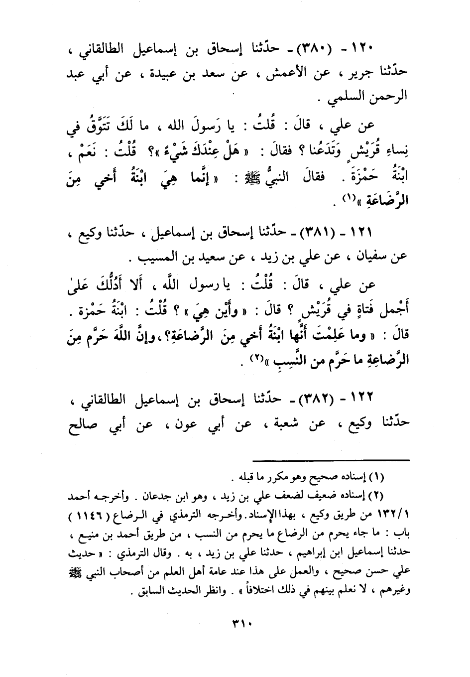 380 - حَدَّثَنَا إِسْحَاقُ بْنُ إِسْمَاعِيلَ الطَّالْقَانِيُّ، حَدَّثَنَا جَرِيرٌ، عَنِ الْأَعْمَشِ، عَنْ سَعْدِ بْنِ عُبَيْدَةَ، عَنْ أَبِي عَبْدِ الرَّحْمَنِ السُّلَمِيِّ، عَنْ عَلِيٍّ، قَالَ: قُلْتُ: يَا رَسُولَ اللَّهِ، مَا لَكَ تَتَوَّقُ فِي نِسَاءِ قُرَيْشٍ وَتَدَعُنَا؟ فَقَالَ: «هَلْ عِنْدَكَ شَيْءٌ؟» قُلْتُ: نَعَمْ، ابْنَةُ حَمْزَةَ، فَقَالَ النَّبِيُّ صَلَّى اللهُ عَلَيْهِ وَسَلَّمَ: «§إِنَّمَا هِيَ ابْنَةُ أَخِي مِنَ الرَّضَاعَةِ» Kإسناده صحيح