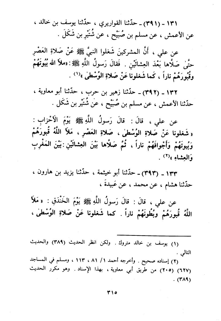 393 - حَدَّثَنَا أَبُو خَيْثَمَةَ، حَدَّثَنَا يَزِيدُ بْنُ هَارُونَ، حَدَّثَنَا هِشَامٌ، عَنْ مُحَمَّدٍ، عَنْ عُبَيْدَةَ، عَنْ عَلِيٍّ، قَالَ: قَالَ رَسُولُ اللَّهِ صَلَّى اللهُ عَلَيْهِ وَسَلَّمَ يَوْمَ الْخَنْدَقِ: «§مَلَأَ اللَّهُ قُبُورَهُمْ وَبُطُونَهُمْ نَارًا، كَمَا شَغَلُونَا عَنْ صَلَاةِ الْوُسْطَى، صَلَاةِ الْعَصْرِ، حَتَّى غَابَتِ الشَّمْسُ» Kإسناده صحيح