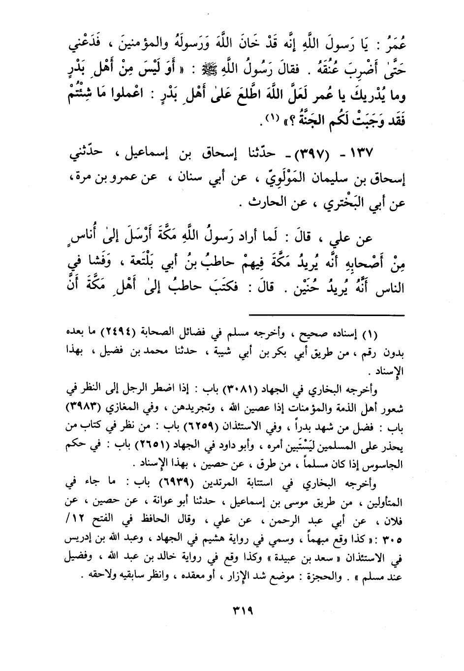 397 - حَدَّثَنَا إِسْحَاقُ بْنُ إِسْمَاعِيلَ، حَدَّثَنِي إِسْحَاقُ بْنُ سُلَيْمَانَ الْمَوْلَوِيُّ، عَنْ أَبِي سِنَانٍ، عَنْ عَمْرِو بْنِ مُرَّةَ، عَنْ أَبِي الْبَخْتَرِيِّ، عَنِ الْحَارِثِ، عَنْ عَلِيٍّ، قَالَ: لَمَّا أَرَادَ رَسُولُ اللَّهِ مَكَّةَ، أَرْسَلَ إِلَى أُنَاسٍ مِنْ أَصْحَابِهِ، أَنَّهُ يُرِيدُ مَكَّةَ فِيهِمْ حَاطِبُ بْنُ أَبِي بَلْتَعَةَ، وَفَشَا فِي النَّاسِ أَنَّهُ يُرِيدُ حُنَيْنًا، قَالَ: فَكَتَبَ حَاطِبٌ إِلَى أَهْلِ مَكَّةَ: أَنَّ -[320]- رَسُولَ اللَّهِ صَلَّى اللهُ عَلَيْهِ وَسَلَّمَ يُرِيدُكُمْ، قَالَ: فَأُخْبِرَ بِهِ رَسُولُ اللَّهِ صَلَّى اللهُ عَلَيْهِ وَسَلَّمَ، قَالَ: فَبَعَثَنِي رَسُولُ اللَّهِ صَلَّى اللهُ عَلَيْهِ وَسَلَّمَ أَنَا وَأَبَا مَرْثَدٍ، وَلَيْسَ مَعَنَا رَجُلٌ إِلَّا وَمَعَهُ فَرَسٌ، فَقَالَ: «ائْتُوا رَوْضَةَ خَاخٍ، فَإِنَّكُمْ سَتَلْقَوْنَ بِهَا امْرَأَةً مَعَهَا كِتَابٌ، فَخُذُوهُ مِنْهَا»، قَالَ: فَانْطَلَقْنَا حَتَّى رَأَيْنَاهَا فِي الْمَكَانِ الَّذِي ذَكَرَ رَسُولُ اللَّهِ صَلَّى اللهُ عَلَيْهِ وَسَلَّمَ، فَقُلْنَا لَهَا: هَاتِ الْكِتَابَ، فَقَالَتْ: مَا مَعِي كِتَابٌ، قَالَ: فَوَضَعْنَا مَتَاعَهَا، فَفَتَّشْنَاهَا، فَلَمْ نَجِدْهُ فِي مَتَاعِهَا، فَقَالَ أَبُومَرْثَدٍ: فَلَعَلَّ أَنْ لَا يَكُونَ مَعَهَا كِتَابٌ، فَقُلْنَا: مَا كُذِبَ رَسُولُ اللَّهِ صَلَّى اللهُ عَلَيْهِ وَسَلَّمَ، وَلَا كَذَبَنَا، فَقُلْنَا لَهَا: لَتُخْرِجِنَّهُ أَوْ لَنُعَرِّيَنَّكِ، فَقَالَتْ: أَمَا تَتَّقُونَ اللَّهَ؟ أَمَا أَنْتُمْ مُسْلِمُونَ؟ فَقُلْنَا: لَتُخْرِجِنَّهُ أَوْ لَنُعَرِّيَنَّكِ، قَالَ عَمْرُو بْنُ مُرَّةَ: فَأَخْرَجَتْهُ مِنْ حُجْزَتِهَا، فَقَالَ حَبِيبُ بْنُ أَبِي ثَابِتٍ: وَأَخْرَجَتْهُ مِنْ قُبُلِهَا، فَأَتَيْنَا النَّبِيَّ صَلَّى اللهُ عَلَيْهِ وَسَلَّمَ، فَإِذَا الْكِتَابُ مِنْ حَاطِبِ بْنِ أَبِي بَلْتَعَةَ، فَقَامَ عُمَرُ فَقَالَ: يَا رَسُولَ اللَّهِ، خَانَ اللَّهَ، خَانَ رَسُولَهُ، ائْذَنْ لِي فَأَضْرِبَ عُنُقَهُ، فَقَالَ رَسُولُ اللَّهِ صَلَّى اللهُ عَلَيْهِ وَسَلَّمَ: «أَلَيْسَ قَدْ شَهِدَ بَدْرًا؟» قَالُوا: بَلَى يَا رَسُولَ اللَّهِ، قَالَ عُمَرُ: بَلَى، وَلَكِنَّهُ قَدْ نَكَثَ وَظَاهَرَ أَعْدَاءَكَ عَلَيْكَ، فَقَالَ رَسُولُ اللَّهِ صَلَّى اللهُ عَلَيْهِ وَسَلَّمَ: " §فَلَعَلَّ اللَّهَ قَدِ اطَّلَعَ عَلَى أَهْلِ بَدْرٍ، فَقَالَ: اعْمَلُوا مَا شِئْتُمْ "، فَفَاضَتْ عَيْنَا عُمَرَ، فَقَالَ: اللَّهُ وَرَسُولُهُ أَعْلَمُ، وَأَرْسَلَ رَسُولُ اللَّهِ صَلَّى اللهُ عَلَيْهِ وَسَلَّمَ إِلَى حَاطِبٍ، فَقَالَ: «مَا حَمَلَكَ عَلَى مَا صَنَعْتَ؟»، قَالَ: يَا رَسُولَ اللَّهِ، كُنْتُ امْرَأً مُلْصَقًا فِي قُرَيْشٍ، فَكَانَ بِهَا أَهْلِي وَمَالِي، وَلَمْ يَكُنْ مِنْ أَصْحَابِكَ أَحَدٌ إِلَّا وَلَهُ بِمَكَّةَ مَنْ يَمْنَعُ أَهْلَهُ وَمَالَهُ، فَكَتَبْتُ إِلَيْهِمْ بِذَلِكَ، وَاللَّهِ يَا رَسُولَ اللَّهِ، إِنِّي لِمُؤْمِنٌ بِاللَّهِ وَبِرَسُولِهِ، فَقَالَ رَسُولُ اللَّهِ صَلَّى اللهُ عَلَيْهِ وَسَلَّمَ: «صَدَقَ حَاطِبٌ، فَلَا تَقُولُوا لِحَاطِبٍ إِلَّا خَيْرًا» قَالَ حَبِيبٌ: فَأَنْزَلَ اللَّهُ: {يَا أَيُّهَا الَّذِينَ آمَنُوا لَا تَتَّخِذُوا عَدُوِّي وَعَدُوَّكُمْ أَوْلِيَاءَ تُلْقُونَ إِلَيْهِمْ بِالْمَوَدَّةِ} [الممتحنة: 1] Kإسناده ضعيف