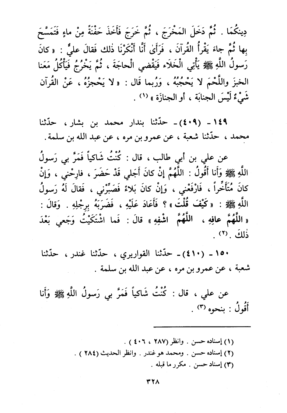 410 - حَدَّثَنَا الْقَوَارِيرِيُّ، حَدَّثَنَا غُنْدَرٌ، حَدَّثَنَا شُعْبَةُ، عَنْ عَمْرِو بْنِ مُرَّةَ، عَنْ عَبْدِ اللَّهِ بْنِ سَلَمَةَ، عَنْ عَلِيٍّ، قَالَ: كُنْتُ شَاكِيًا فَمَرَّ بِي رَسُولُ اللَّهِ صَلَّى اللهُ عَلَيْهِ وَسَلَّمَ وَأَنَا أَقُولُ: بِنَحْوِهِKإسناده حسن