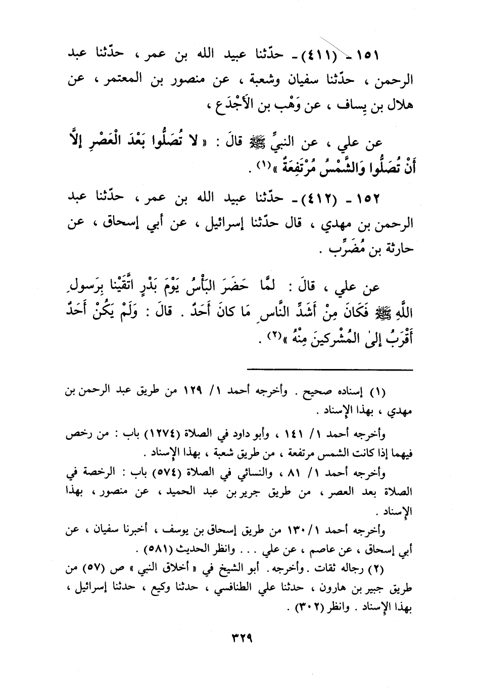411 - حَدَّثَنَا عُبَيْدُ اللَّهِ بْنُ عُمَرَ، حَدَّثَنَا عَبْدُ الرَّحْمَنِ، حَدَّثَنَا سُفْيَانُ، وَشُعْبَةُ، عَنْ مَنْصُورٍ، عَنْ هِلَالِ بْنِ يَسَافٍ، عَنْ وَهْبِ بْنِ الْأَجْدَعِ، عَنْ عَلِيٍّ، عَنِ النَّبِيِّ صَلَّى اللهُ عَلَيْهِ وَسَلَّمَ، قَالَ: «§لَا تُصَلُّوا بَعْدَ الْعَصْرِ إِلَّا أَنْ تُصَلُّوا وَالشَّمْسُ مُرْتَفِعَةٌ» Kإسناده صحيح