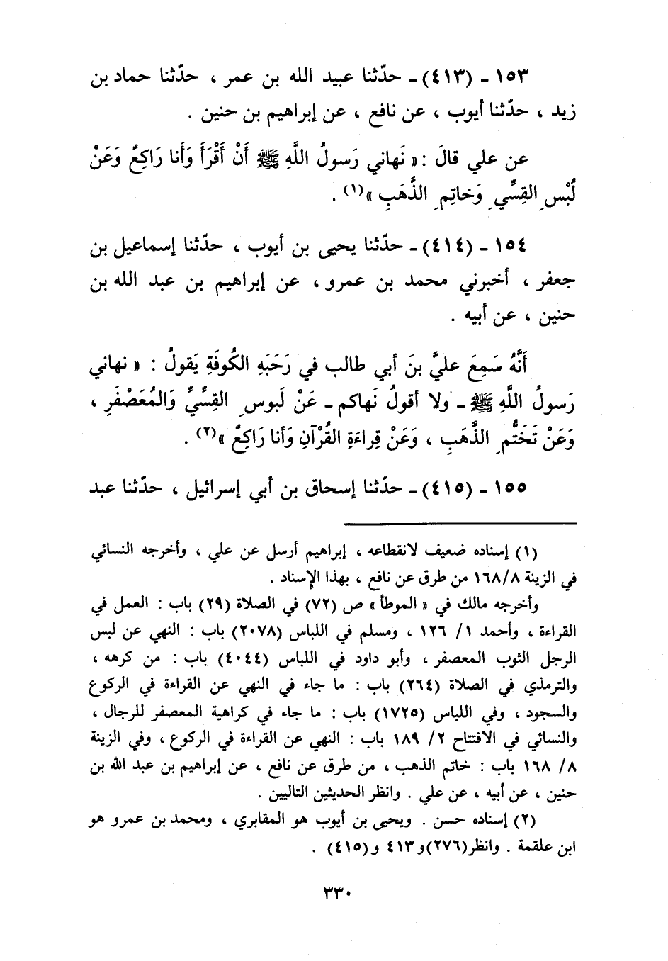 413 - حَدَّثَنَا عُبَيْدُ اللَّهِ بْنُ عُمَرَ، حَدَّثَنَا حَمَّادُ بْنُ زَيْدٍ، حَدَّثَنَا أَيُّوبُ، عَنْ نَافِعٍ، عَنْ إِبْرَاهِيمَ بْنِ حُنَيْنٍ، عَنْ عَلِيٍّ، قَالَ: «§نَهَانِي رَسُولُ اللَّهِ صَلَّى اللهُ عَلَيْهِ وَسَلَّمَ، أَنْ أَقْرَأَ وَأَنَا رَاكِعٌ، وَعَنْ لُبْسِ الْقَسِّيِّ، وَخَاتَمِ الذَّهَبِ» Kإسناده ضعيف