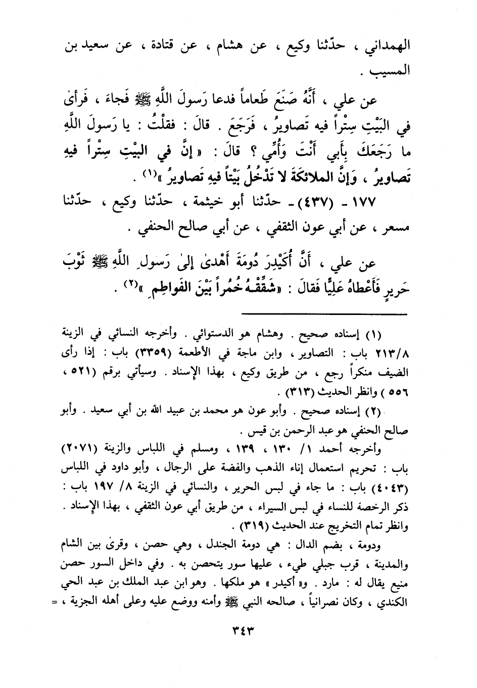 437 - حَدَّثَنَا أَبُو خَيْثَمَةَ، حَدَّثَنَا وَكِيعٌ، حَدَّثَنَا مِسْعَرٌ، عَنْ أَبِي عَوْنٍ الثَّقَفِيِّ، عَنْ أَبِي صَالِحٍ الْحَنَفِيِّ، عَنْ عَلِيٍّ، أَنَّ أُكَيْدِرَ دُومَةَ أَهْدَى إِلَى رَسُولِ اللَّهِ صَلَّى اللهُ عَلَيْهِ وَسَلَّمَ ثَوْبَ حَرِيرٍ، فَأَعْطَاهُ عَلِيًّا، فَقَالَ: «§شَقِّقْهُ خُمُرًا بَيْنَ الْفَوَاطِمِ» Kإسناده صحيح