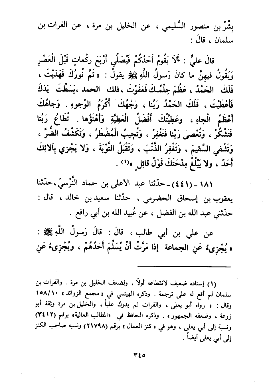 441 - حَدَّثَنَا عَبْدُ الْأَعْلَى بْنُ حَمَّادٍ النَّرْسِيُّ، حَدَّثَنَا يَعْقُوبُ بْنُ إِسْحَاقَ الْحَضْرَمِيُّ، حَدَّثَنَا سَعِيدُ بْنُ خَالِدٍ، قَالَ: حَدَّثَنِي عَبْدُ اللَّهِ بْنُ الْفَضْلِ، عَنْ عُبَيْدِ اللَّهِ بْنِ أَبِي رَافِعٍ، عَنْ عَلِيِّ بْنِ أَبِي طَالِبٍ، قَالَ: قَالَ رَسُولُ اللَّهِ صَلَّى اللهُ عَلَيْهِ وَسَلَّمَ: «§يُجْزِئُ عَنِ الْجَمَاعَةِ إِذَا مَرَّتْ أَنْ يُسَلِّمَ أَحَدُهُمْ، وَيُجْزِئُ عَنِ الْقُعُودِ أَنْ يَرُدَّ أَحَدُهُمْ» Kإسناده ضعيف