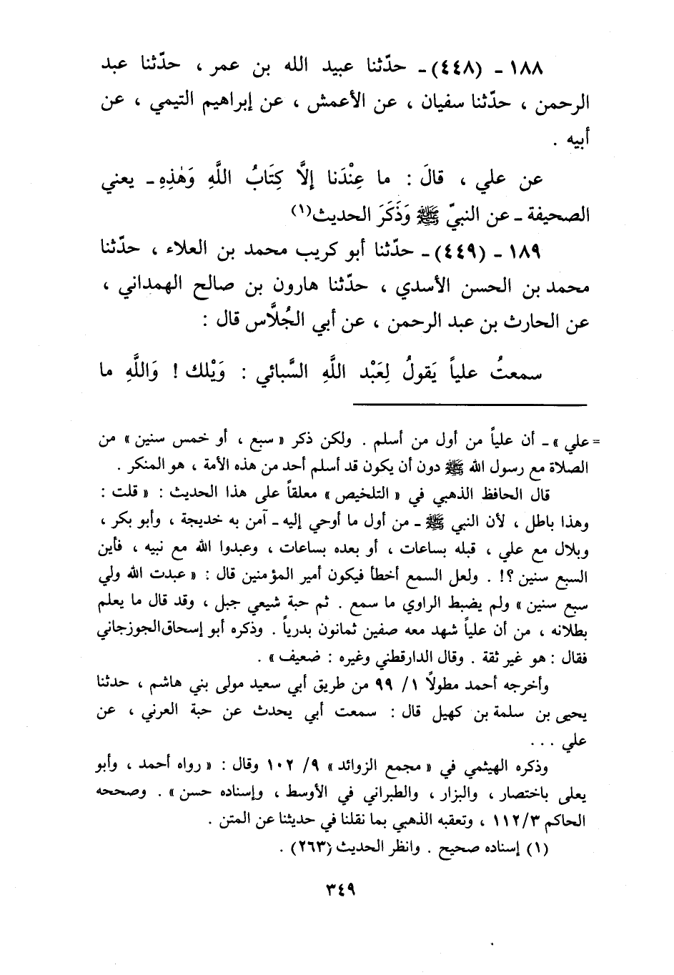 448 - حَدَّثَنَا عُبَيْدُ اللَّهِ بْنُ عُمَرَ، حَدَّثَنَا عَبْدُ الرَّحْمَنِ، حَدَّثَنَا سُفْيَانُ، عَنِ الْأَعْمَشِ، عَنْ إِبْرَاهِيمَ التَّيْمِيِّ، عَنْ أَبِيهِ، عَنْ عَلِيٍّ، قَالَ: «§مَا عِنْدَنَا إِلَّا كِتَابُ اللَّهِ وَهَذِهِ» يَعْنِي الصَّحِيفَةَ، عَنِ النَّبِيِّ صَلَّى اللهُ عَلَيْهِ وَسَلَّمَ. وَذَكَرَ الْحَدِيثَKإسناده صحيح