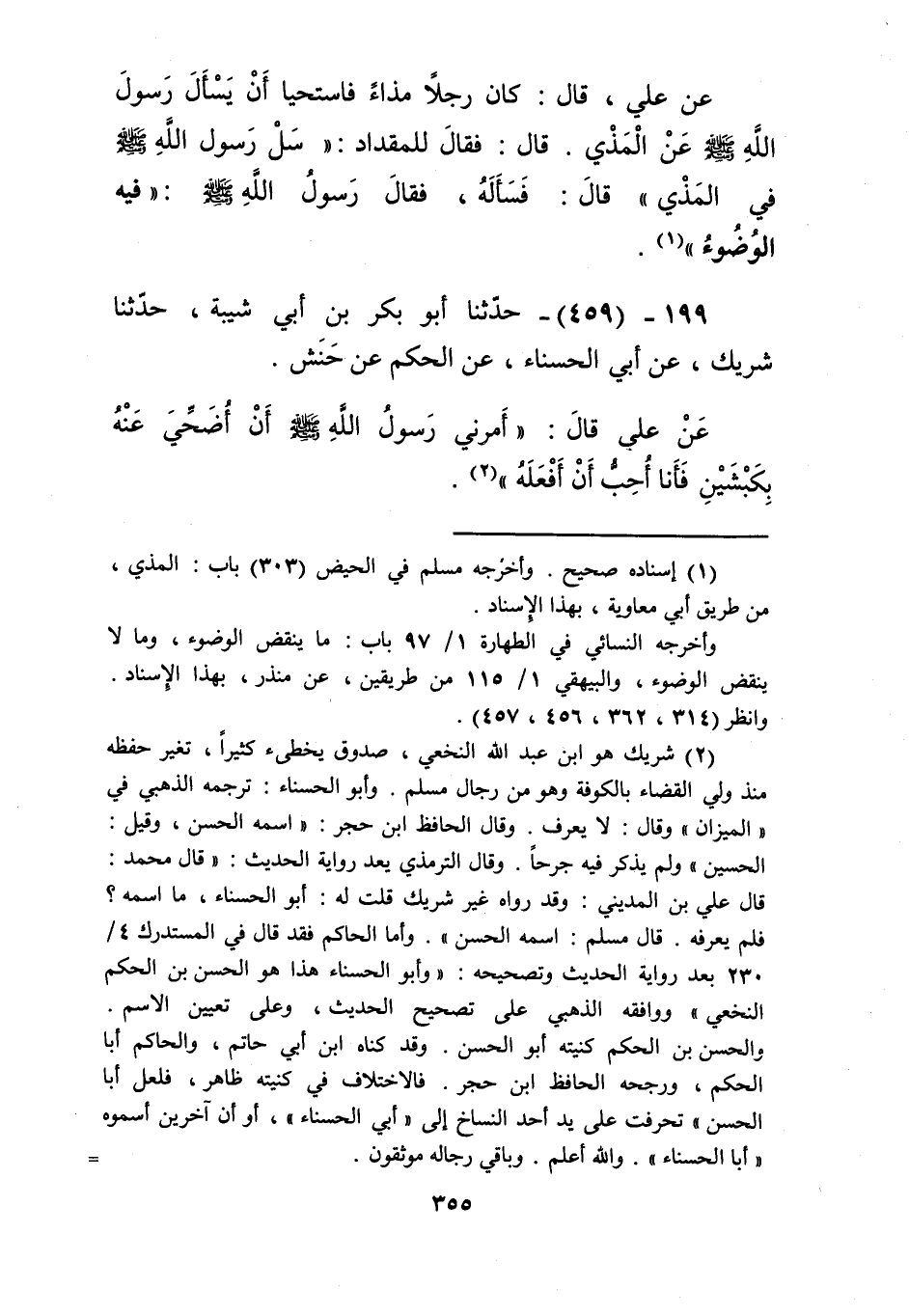 459 - حَدَّثَنَا أَبُو بَكْرِ بْنُ أَبِي شَيْبَةَ، حَدَّثَنَا شَرِيكٌ، عَنْ أَبِي الْحَسْنَاءِ، عَنِ الْحَكَمِ، عَنْ حَنَشٍ، عَنْ عَلِيٍّ، قَالَ: «§أَمَرَنِي رَسُولُ اللَّهِ صَلَّى اللهُ عَلَيْهِ وَسَلَّمَ أَنْ أُضَحِّيَ عَنْهُ بِكَبْشَيْنِ، فَأَنَا أُحِبُّ أَنْ أَفْعَلَهُ»