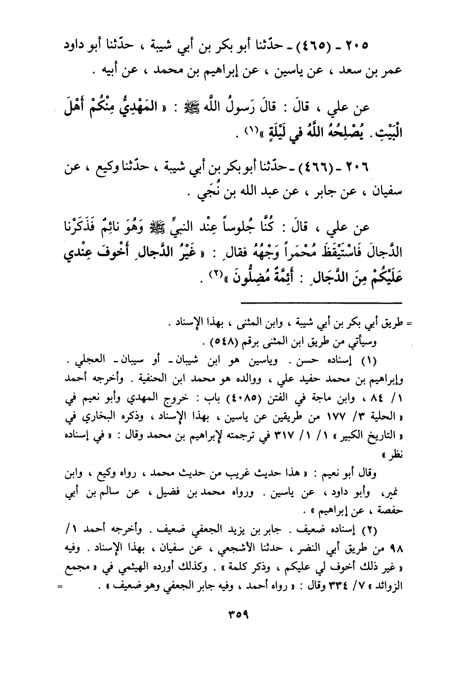 465 - حَدَّثَنَا أَبُو بَكْرِ بْنُ أَبِي شَيْبَةَ، حَدَّثَنَا أَبُو دَاوُدَ عُمَرُ بْنُ سَعْدٍ، عَنْ يَاسِينَ، عَنْ إِبْرَاهِيمَ بْنِ مُحَمَّدٍ، عَنْ أَبِيهِ، عَنْ عَلِيٍّ، قَالَ: قَالَ رَسُولُ اللَّهِ صَلَّى اللهُ عَلَيْهِ وَسَلَّمَ: «§الْمَهْدِيُّ مِنْكُمْ أَهْلَ الْبَيْتِ يُصْلِحُهُ اللَّهُ فِي لَيْلَةٍ» Kإسناده حسن