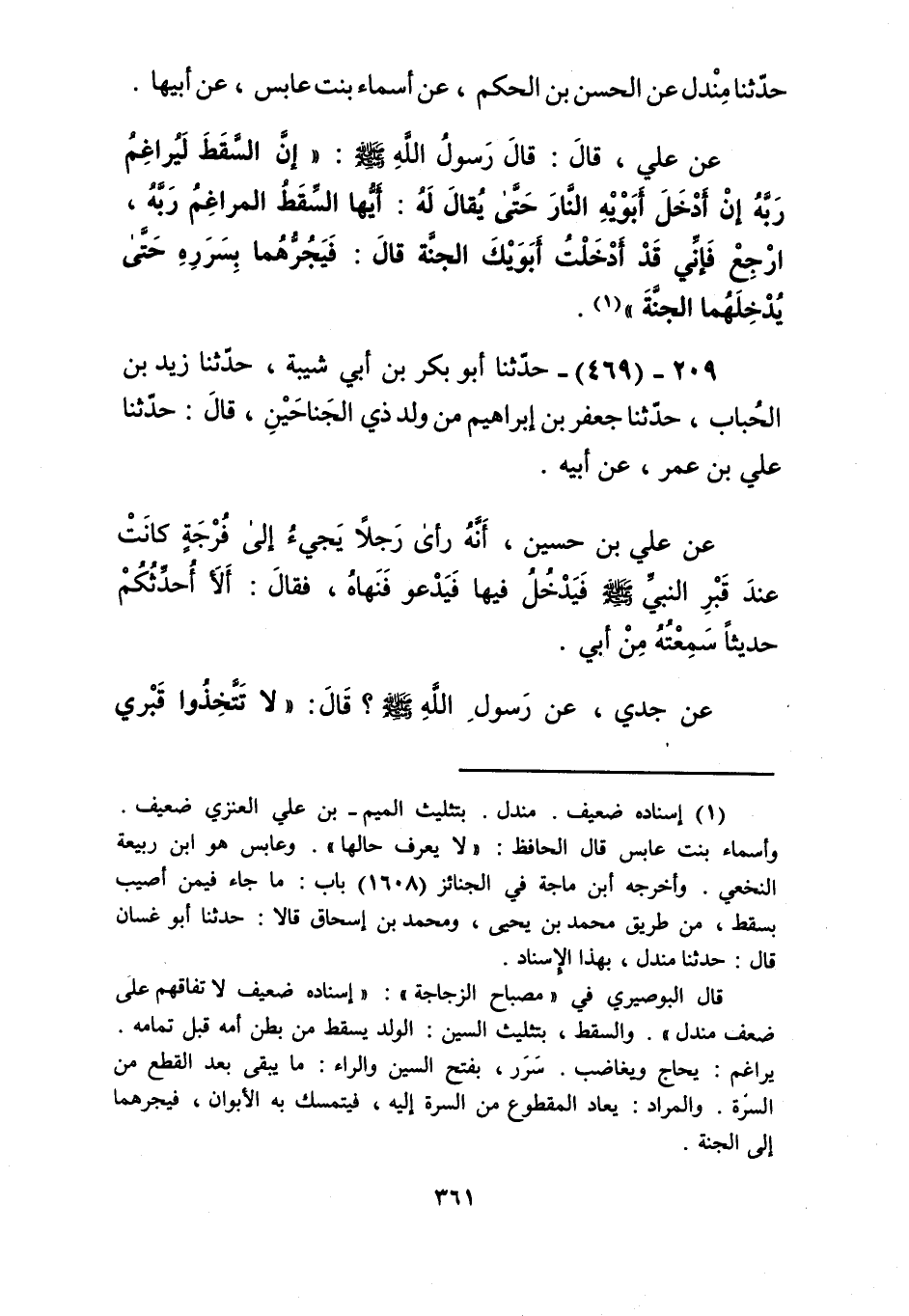 469 - حَدَّثَنَا أَبُو بَكْرِ بْنُ أَبِي شَيْبَةَ، حَدَّثَنَا زَيْدُ بْنُ الْحُبَابِ، حَدَّثَنَا جَعْفَرُ بْنُ إِبْرَاهِيمَ، مِنْ وَلَدِ ذِي الْجَنَاحَيْنِ، قَالَ: حَدَّثَنَا عَلِيُّ بْنُ عُمَرَ، عَنْ أَبِيهِ، عَنْ عَلِيِّ بْنِ حُسَيْنٍ، أَنَّهُ رَأَى رَجُلًا يَجِيءُ إِلَى فُرْجَةٍ كَانَتْ عِنْدَ قَبْرِ النَّبِيِّ صَلَّى اللهُ عَلَيْهِ وَسَلَّمَ، فَيَدْخُلُ فِيهَا فَيَدْعُو، فَنَهَاهُ، فَقَالَ: أَلَا أُحَدِّثُكُمْ حَدِيثًا سَمِعْتُهُ مِنْ أَبِي، عَنْ جَدِّي، عَنْ رَسُولِ اللَّهِ صَلَّى اللهُ عَلَيْهِ وَسَلَّمَ، قَالَ: «§لَا تَتَّخِذُوا قَبْرِي عِيدًا، وَلَا بُيُوتَكُمْ قُبُورًا، فَإِنَّ تَسْلِيمَكُمْ يَبْلُغُنِي أَيْنَمَا كُنْتُمْ» Kإسناده ضعيف