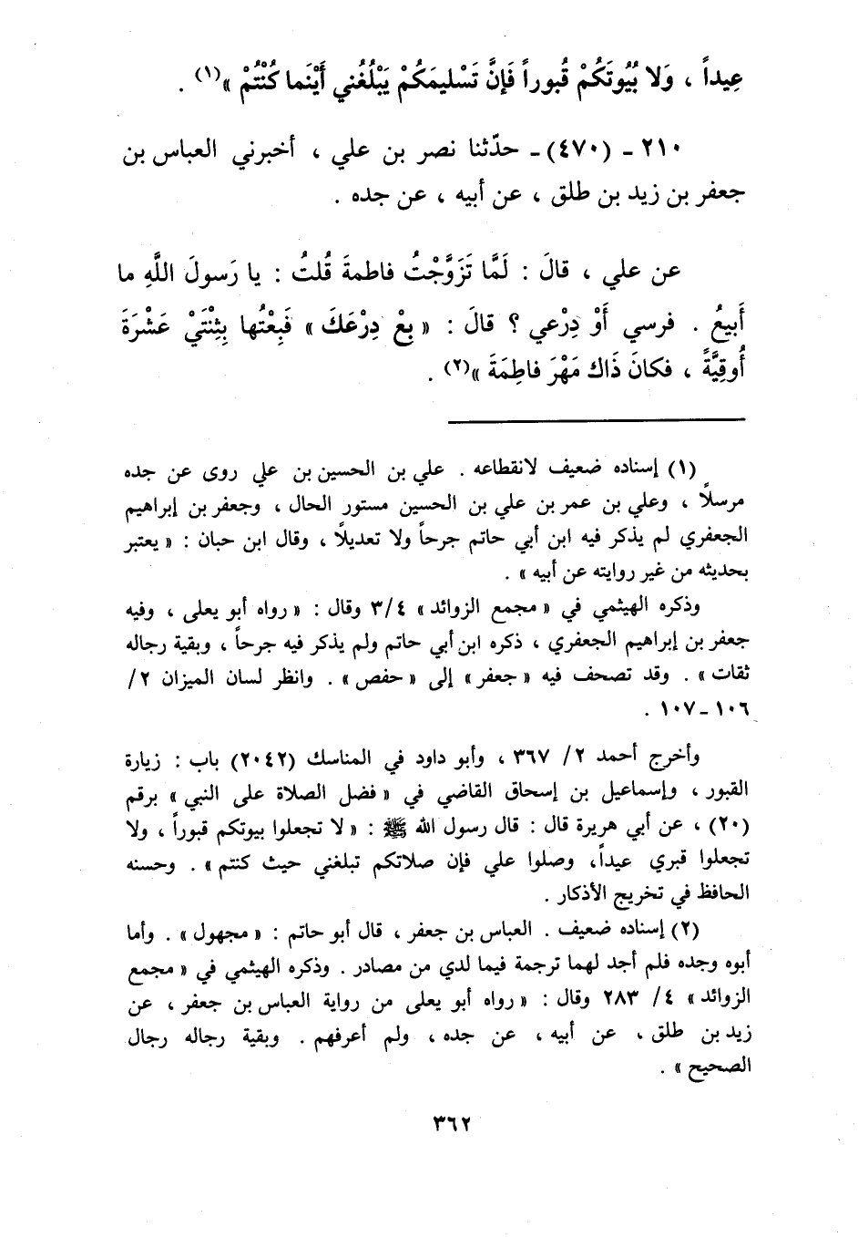 470 - حَدَّثَنَا نَصْرُ بْنُ عَلِيٍّ، أَخْبَرَنِي الْعَبَّاسُ بْنُ جَعْفَرِ بْنِ زَيْدِ بْنِ طَلْقٍ، عَنْ أَبِيهِ، عَنْ جَدِّهِ، عَنْ عَلِيٍّ، قَالَ: لَمَّا §تَزَوَّجْتُ فَاطِمَةَ قُلْتُ: يَا رَسُولَ اللَّهِ، مَا أَبِيعُ، فَرَسِي أَوْ دِرْعِي؟ قَالَ: «بِعْ دِرْعَكَ» فَبِعْتُهَا بِثِنْتَيْ عَشْرَةَ أُوقِيَّةً فَكَانَ ذَاكَ مَهْرُ فَاطِمَةَKإسناده ضعيف