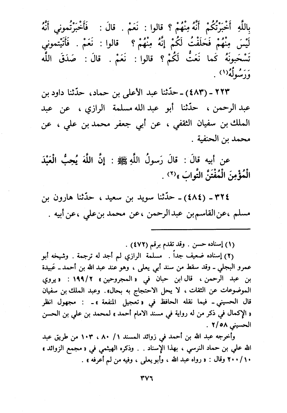 483 - حَدَّثَنَا عَبْدُ الْأَعْلَى بْنُ حَمَّادٍ، حَدَّثَنَا دَاوُدُ بْنُ عَبْدِ الرَّحْمَنِ، حَدَّثَنَا أَبُو عَبْدِ اللَّهِ مَسْلَمَةُ الرَّازِيُّ، عَنْ عَبْدِ الْمَلِكِ بْنِ سُفْيَانَ الثَّقَفِيِّ، عَنْ أَبِي جَعْفَرٍ مُحَمَّدِ بْنِ عَلِيٍّ، عَنْ مُحَمَّدِ بْنِ الْحَنَفِيَّةِ، عَنْ أَبِيهِ، قَالَ: قَالَ رَسُولُ اللَّهِ صَلَّى اللهُ عَلَيْهِ وَسَلَّمَ: «إِنَّ §اللَّهَ يُحِبُّ الْعَبْدَ الْمُؤْمِنَ الْمُفْتَنَّ التَّوَّابَ» Kإسناده ضعيف جدا