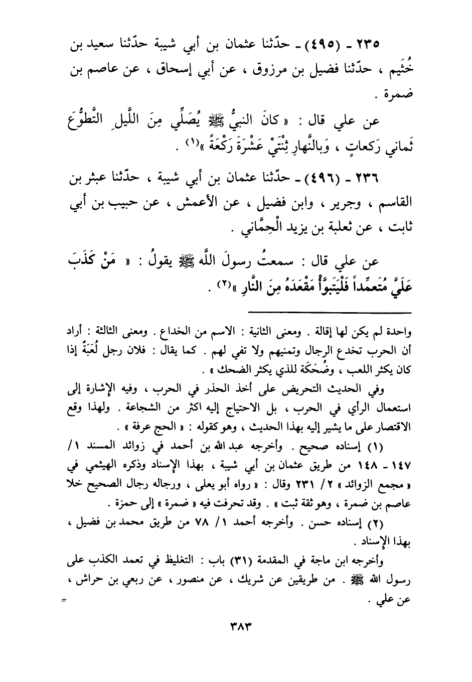 495 - حَدَّثَنَا عُثْمَانُ بْنُ أَبِي شَيْبَةَ، حَدَّثَنَا سَعِيدُ بْنُ خُثَيْمٍ، حَدَّثَنَا فُضَيْلُ بْنُ مَرْزُوقٍ، عَنْ أَبِي إِسْحَاقَ، عَنْ عَاصِمِ بْنِ ضَمْرَةَ، عَنْ عَلِيٍّ، قَالَ: «كَانَ النَّبِيُّ صَلَّى اللهُ عَلَيْهِ وَسَلَّمَ §يُصَلِّي مِنَ اللَّيْلِ التَّطَوُّعَ ثَمَانِيَ رَكَعَاتٍ، وَبِالنَّهَارِ ثِنْتَيْ عَشْرَةَ رَكْعَةً» Kإسناده صحيح