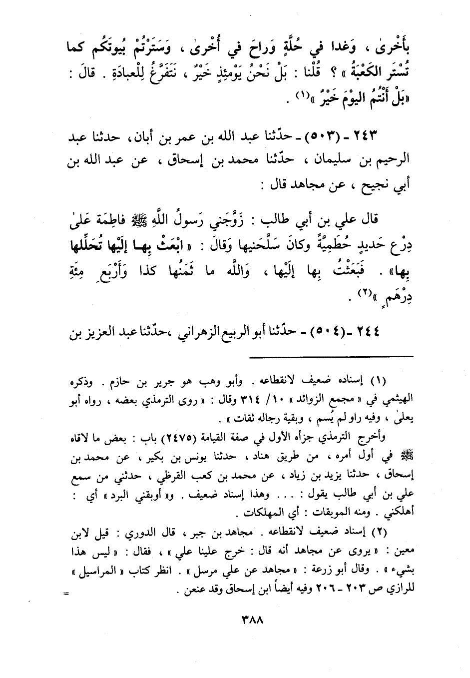 503 - حَدَّثَنَا عَبْدُ اللَّهِ بْنُ عُمَرَ بْنِ أَبَانَ، حَدَّثَنَا عَبْدُ الرَّحِيمِ بْنُ سُلَيْمَانَ، حَدَّثَنَا مُحَمَّدُ بْنُ إِسْحَاقَ، عَنْ عَبْدِ اللَّهِ بْنِ أَبِي نَجِيحٍ، عَنْ مُجَاهِدٍ، قَالَ: قَالَ عَلِيُّ بْنُ أَبِي طَالِبٍ، §زَوَّجَنِي رَسُولُ اللَّهِ صَلَّى اللهُ عَلَيْهِ وَسَلَّمَ فَاطِمَةَ عَلَى دِرْعِ حَدِيدٍ حُطَمِيَّةٍ، وَكَانَ سَلَّحَنِيهَا وَقَالَ: «ابْعَثْ بِهَا إِلَيْهَا تُحِلِّلْهَا بِهَا»، فَبَعَثْتُ بِهَا إِلَيْهَا، وَاللَّهِ مَا ثَمَنُهَا كَذَا وَأَرْبَعِ مِائَةِ دِرْهَمٍKإسناده ضعيف