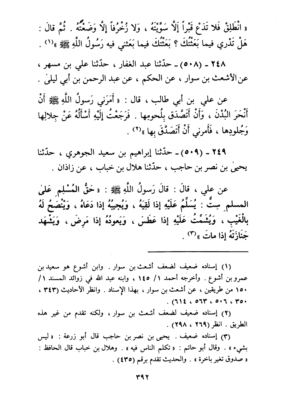 508 - حَدَّثَنَا عَبْدُ الْغَفَّارِ، حَدَّثَنَا عَلِيُّ بْنُ مُسْهِرٍ، عَنِ الْأَشْعَثِ بْنِ سَوَّارٍ، عَنِ الْحَكَمِ، عَنْ عَبْدِ الرَّحْمَنِ بْنِ أَبِي لَيْلَى، عَنْ عَلِيِّ بْنِ أَبِي طَالِبٍ، قَالَ: «أَمَرَنِي رَسُولُ اللَّهِ صَلَّى اللهُ عَلَيْهِ وَسَلَّمَ أَنْ §أَنْحَرَ الْبُدْنَ، وَأَنْ أَتَصَدَّقَ بِلُحُومِهَا، فَرَجَعْتُ إِلَيْهِ أَسْأَلُهُ عَنْ جِلَالِهَا وَجُلُودِهَا، فَأَمَرَنِي أَنْ أَتَصَدَّقَ بِهَا» Kإسناده ضعيف