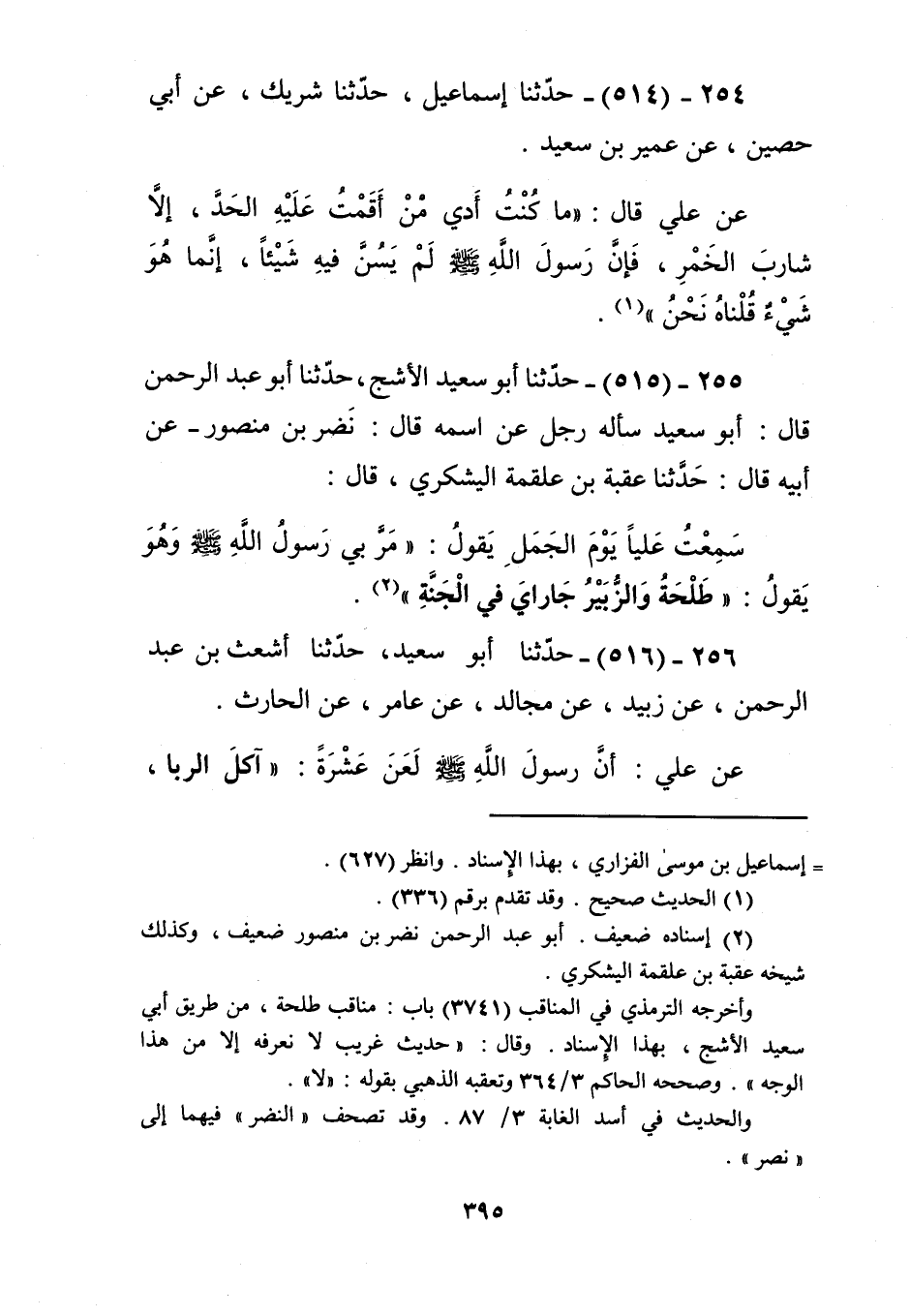 515 - حَدَّثَنَا أَبُو سَعِيدٍ الْأَشَجُّ، حَدَّثَنَا أَبُو عَبْدِ الرَّحْمَنِ، قَالَ: أَبُو سَعِيدٍ سَأَلَهُ رَجُلٌ، عَنِ اسْمِهِ قَالَ: نَضْرُ بْنُ مَنْصُورٍ، عَنْ أَبِيهِ، قَالَ: حَدَّثَنَا عُقْبَةُ بْنُ عَلْقَمَةَ الْيَشْكُرِيُّ، قَالَ: سَمِعْتُ عَلِيًّا، يَوْمَ الْجَمَلِ، يَقُولُ: مَرَّ بِي رَسُولُ اللَّهِ صَلَّى اللهُ عَلَيْهِ وَسَلَّمَ وَهُوَ يَقُولُ: «§طَلْحَةُ وَالزُّبَيْرُ جَارَايَ فِي الْجَنَّةِ» Kإسناده ضعيف