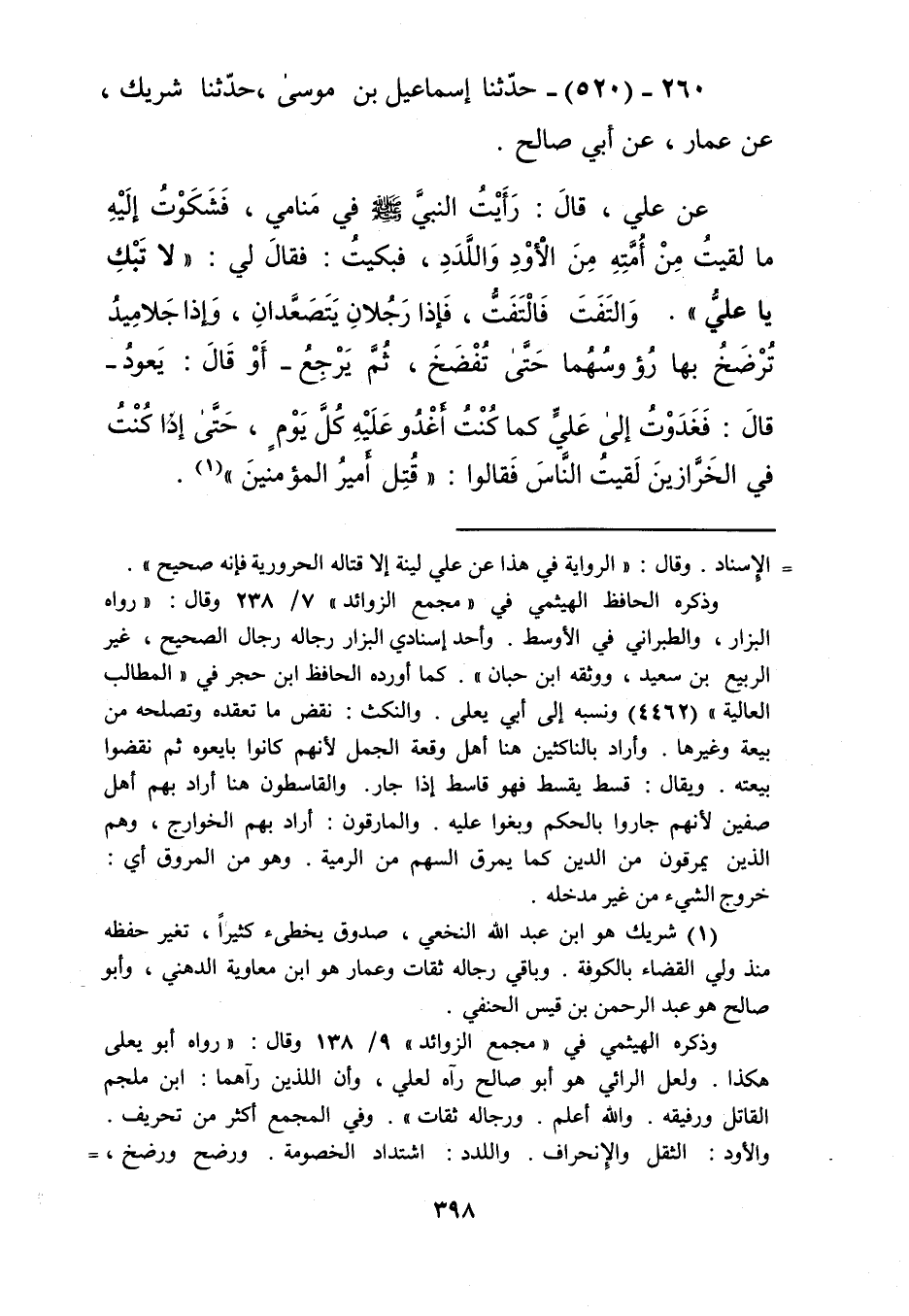 520 - حَدَّثَنَا إِسْمَاعِيلُ بْنُ مُوسَى، حَدَّثَنَا شَرِيكٌ، عَنْ عَمَّارٍ، عَنْ أَبِي صَالِحٍ، عَنْ عَلِيٍّ، قَالَ: §رَأَيْتُ النَّبِيَّ صَلَّى اللهُ عَلَيْهِ وَسَلَّمَ فِي مَنَامِي، فَشَكَوْتُ إِلَيْهِ مَا لَقِيتُ مِنْ أُمَّتِهِ مِنَ الْأَوْدِ وَاللَّدَدِ فَبَكَيْتُ، فَقَالَ لِي: «لَا تَبْكِ يَا عَلِيُّ»، وَالْتَفَتَ فَالْتَفَتُّ، فَإِذَا رَجُلَانِ يَتَصَعَدَانِ وَإِذَا جَلَامِيدُ تُرْضَخُ بِهَا رُءُوسُهُمَا حَتَّى تُفْضَخَ ثُمَّ يَرْجِعُ، أَوْ قَالَ: يَعُودُ، قَالَ: فَغَدَوْتُ إِلَى عَلِيٍّ كَمَا كُنْتُ أَغْدُو عَلَيْهِ كُلَّ يَوْمٍ، حَتَّى إِذَا كُنْتُ فِي الْخَرَّازِينَ لَقِيتُ النَّاسَ، فَقَالُوا: قُتِلَ أَمِيرُ الْمُؤْمِنِينَ