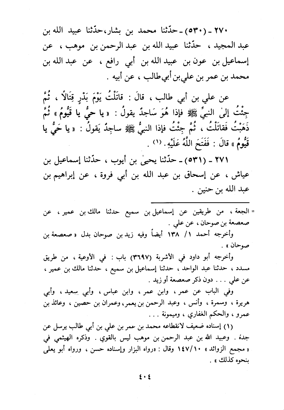 530 - حَدَّثَنَا مُحَمَّدُ بْنُ بَشَّارٍ، حَدَّثَنَا عُبَيْدُ اللَّهِ بْنُ عَبْدِ الْمَجِيدِ، حَدَّثَنَا عُبَيْدُ اللَّهِ بْنُ عَبْدِ الرَّحْمَنِ بْنِ مَوْهَبٍ، عَنْ إِسْمَاعِيلَ بْنِ عَوْنِ بْنِ عُبَيْدِ اللَّهِ بْنِ أَبِي رَافِعٍ، عَنْ عَبْدِ اللَّهِ بْنِ مُحَمَّدِ بْنِ عُمَرَ بْنِ عَلِيِّ بْنِ أَبِي طَالِبٍ، عَنْ أَبِيهِ، عَنْ عَلِيِّ بْنِ أَبِي طَالِبٍ، قَالَ: قَاتَلْتُ يَوْمَ بَدْرٍ قِتَالًا، ثُمَّ §جِئْتُ إِلَى النَّبِيِّ صَلَّى اللهُ عَلَيْهِ وَسَلَّمَ فَإِذَا هُوَ سَاجِدٌ، يَقُولُ: «يَا حَيُّ يَا قَيُّومُ»، ثُمَّ ذَهَبْتُ فَقَاتَلْتُ ثُمَّ جِئْتُ فَإِذَا النَّبِيُّ صَلَّى اللهُ عَلَيْهِ وَسَلَّمَ سَاجِدٌ يَقُولُ: «يَا حَيُّ يَا قَيُّومُ»، قَالَ: فَفَتَحَ اللَّهُ عَلَيْهِKإسناده ضعيف