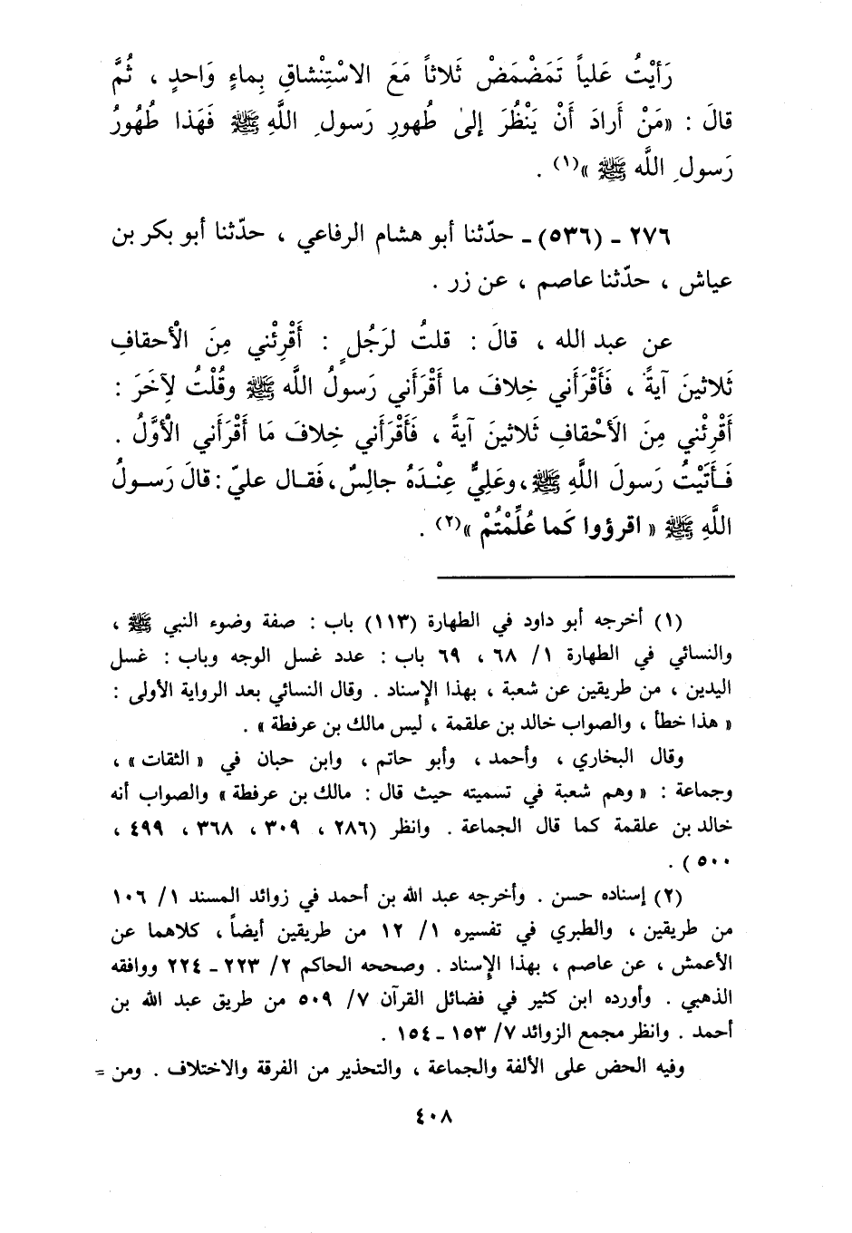 536 - حَدَّثَنَا أَبُو هِشَامٍ الرِّفَاعِيُّ، حَدَّثَنَا أَبُو بَكْرِ بْنُ عَيَّاشٍ، حَدَّثَنَا عَاصِمٌ، عَنْ زِرٍّ، عَنْ عَبْدِ اللَّهِ، قَالَ: قُلْتُ لِرَجُلٍ: أَقْرِئْنِي مِنَ الْأَحْقَافِ ثَلَاثِينَ آيَةً، فَأَقْرَأَنِي خِلَافَ مَا أَقْرَأَنِي رَسُولُ اللَّهِ صَلَّى اللهُ عَلَيْهِ وَسَلَّمَ، وِقُلْتُ لَآخَرَ: أَقْرِئْنِي مِنَ الْأَحْقَافِ ثَلَاثِينَ آيَةً، فَأَقْرَأَنِي خِلَافَ مَا أَقْرَأَنِيَ الْأَوَّلُ، فَأَتَيْتُ رَسُولَ اللَّهِ صَلَّى اللهُ عَلَيْهِ وَسَلَّمَ وَعَلِيٌّ عِنْدَهُ جَالِسٌ، فَقَالَ عَلِيٌّ: قَالَ رَسُولُ اللَّهِ صَلَّى اللهُ عَلَيْهِ وَسَلَّمَ: «§اقْرَءُوا كَمَا عُلِّمْتُمْ» Kإسناده حسن