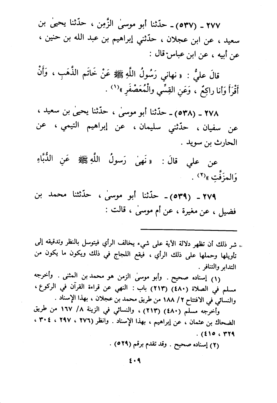 537 - حَدَّثَنَا أَبُو مُوسَى الزَّمِنُ، حَدَّثَنَا يَحْيَى بْنُ سَعِيدٍ، عَنِ ابْنِ عَجْلَانَ، حَدَّثَنِي إِبْرَاهِيمُ بْنُ عَبْدِ اللَّهِ بْنِ حُنَيْنٍ، عَنْ أَبِيهِ، عَنِ ابْنِ عَبَّاسٍ، قَالَ: قَالَ عَلِيٌّ: «§نَهَانِي رَسُولُ اللَّهِ صَلَّى اللهُ عَلَيْهِ وَسَلَّمَ عَنْ خَاتَمِ الذَّهَبِ، وَأَنْ أَقْرَأَ وَأَنَا رَاكِعٌ، وَعَنِ الْقَسِّيِّ وَالْمُعَصْفَرِ» Kإسناده صحيح