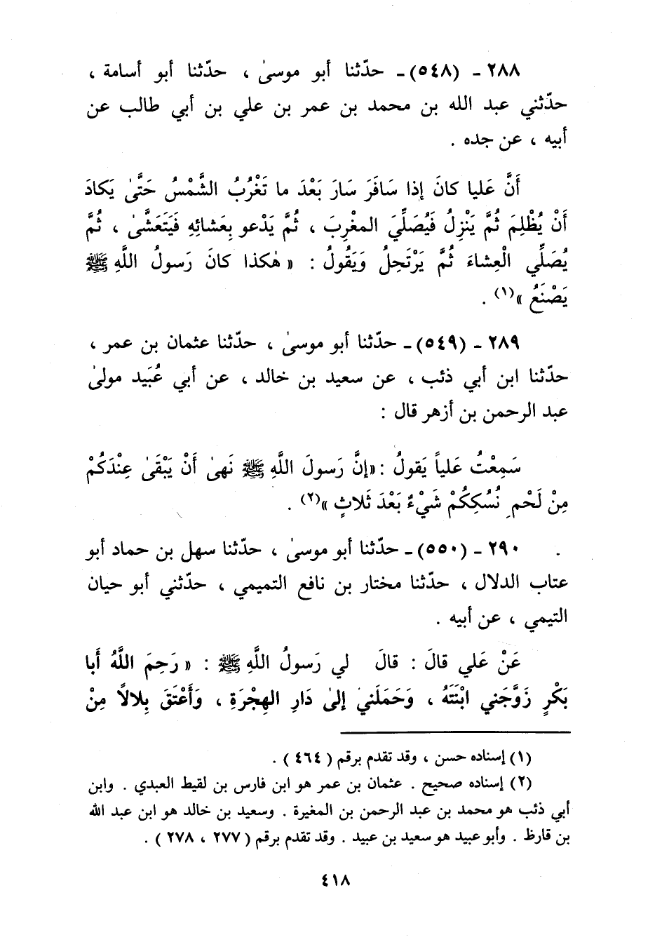 548 - حَدَّثَنَا أَبُو مُوسَى، حَدَّثَنَا أَبُو أُسَامَةَ، حَدَّثَنِي عَبْدُ اللَّهِ بْنُ مُحَمَّدِ بْنِ عُمَرَ بْنِ عَلِيِّ بْنِ أَبِي طَالِبٍ، عَنْ أَبِيهِ، عَنْ جَدِّهِ، أَنَّ عَلِيًّا كَانَ §إِذَا سَافَرَ سَارَ بَعْدَ مَا تَغْرُبُ الشَّمْسُ حَتَّى يَكَادُ أَنْ يُظْلِمَ، ثُمَّ يَنْزِلُ فَيُصَلِّي الْمَغْرِبَ، ثُمَّ يَدْعُو بِعَشَائِهِ فَيَتَعَشَّى، ثُمَّ يُصَلِّي الْعِشَاءَ، ثُمَّ يَرْتَحِلُ، وَيَقُولُ: «هَكَذَا كَانَ رَسُولُ اللَّهِ صَلَّى اللهُ عَلَيْهِ وَسَلَّمَ يَصْنَعُ» Kإسناده حسن