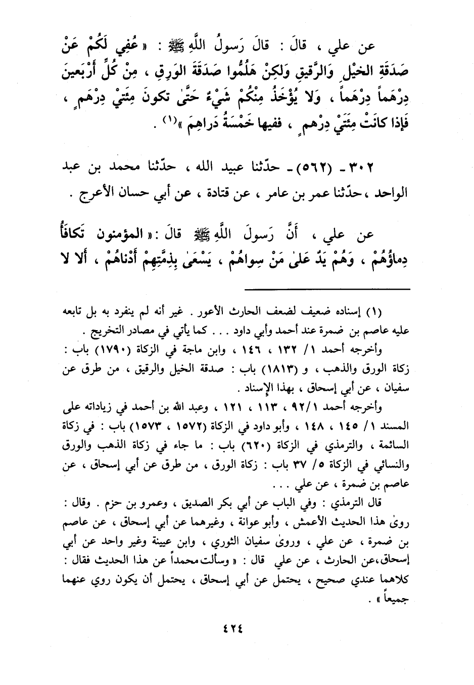 562 - حَدَّثَنَا عُبَيْدُ اللَّهِ، حَدَّثَنَا مُحَمَّدُ بْنُ عَبْدِ الْوَاحِدِ، حَدَّثَنَا عُمَرُ بْنُ عَامِرٍ، عَنْ قَتَادَةَ، عَنْ أَبِي حَسَّانَ الْأَعْرَجِ، عَنْ عَلِيٍّ، أَنَّ رَسُولَ اللَّهِ صَلَّى اللهُ عَلَيْهِ وَسَلَّمَ، قَالَ: «§الْمُؤْمِنُونَ تَكَافَأُ دِمَاؤُهُمْ، وَهُمْ يَدٌ عَلَى مَنْ سِوَاهُمْ، يَسْعَى بِذِمَّتِهِمْ أَدْنَاهُمْ، أَلَا لَا يُقْتَلُ مُؤْمِنٌ بِكَافِرٍ، وَلَا ذُو عَهْدٍ فِي عَهْدِهِ» Kإسناده ضعيف